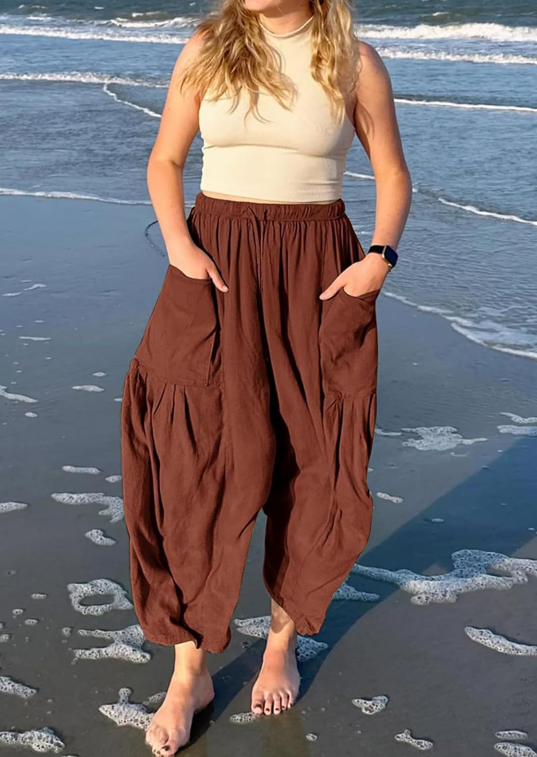 CHARTOU Boho Wide Leg Palazzo Pants for Women Casual Drawstring Pants Beach Flowy Summer Pants Gauze Lounge(Coffee)