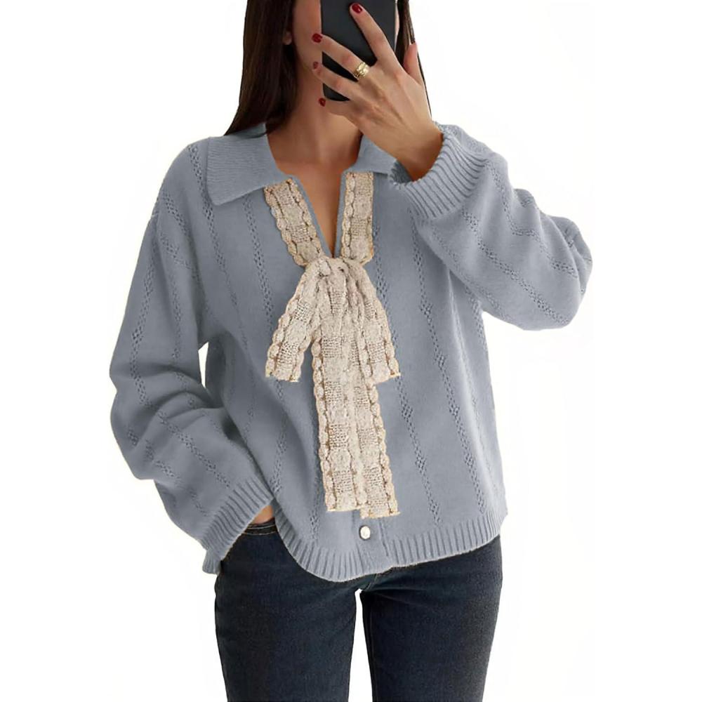 Front bow tie lace patchwork cardigan/ Trendy fall cardigan sweaters for dressy lady outfits/ Casual lapel collar open front cardigan sweater for women/ Dressy Lady Cardigan for Fall Outfits: This unique lace patchwork bow tie women cardigan is comfortable yet structured for a polished look, effortlessly adding a touch of sophisticated and feminine/ Design: Bow tie lace patchwork cardigan/ Lapel collar fall cardigan sweater/ Long sleeve sweaters/ Rib knit cuffs/ Button down v neck cardigan/ Open front cardigan sweater/ Lightweight casual sweater coats/ Solid color-Apricot, Black, Blue, Grey, and Yellow/ Occasion: Dressy cardigan sweater for women fall casual sweater/ Cute front bow tie cardigan sweater for women party sweater/ Casual loose fit lace patchwork sweaters for women weekend outfits/ Open front lace cardigan for women business causal cardigan/ Lightweight cardigan sweater for women travel sweater