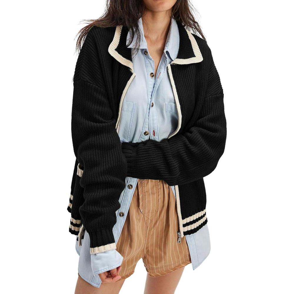CHARTOU Casual Knit Zip Up Sweater for Women 2025 Fall Outfits Contrast Trim Open Front Cardigan Sweater Outwear Coats(Black)