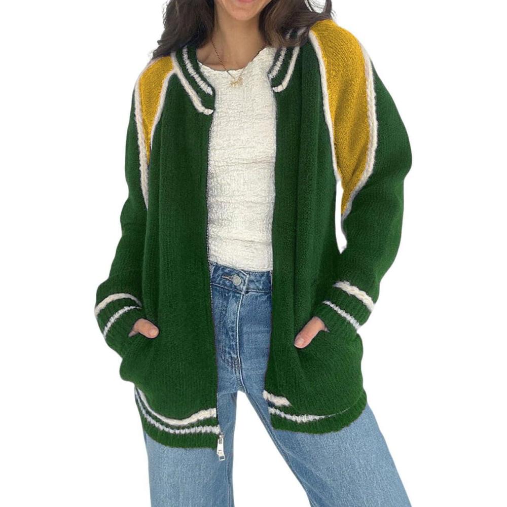 CHARTOU Casual Zip Up Sweaters for Women Fall Color Block Open Cardigan Sweaters Coat(Green)