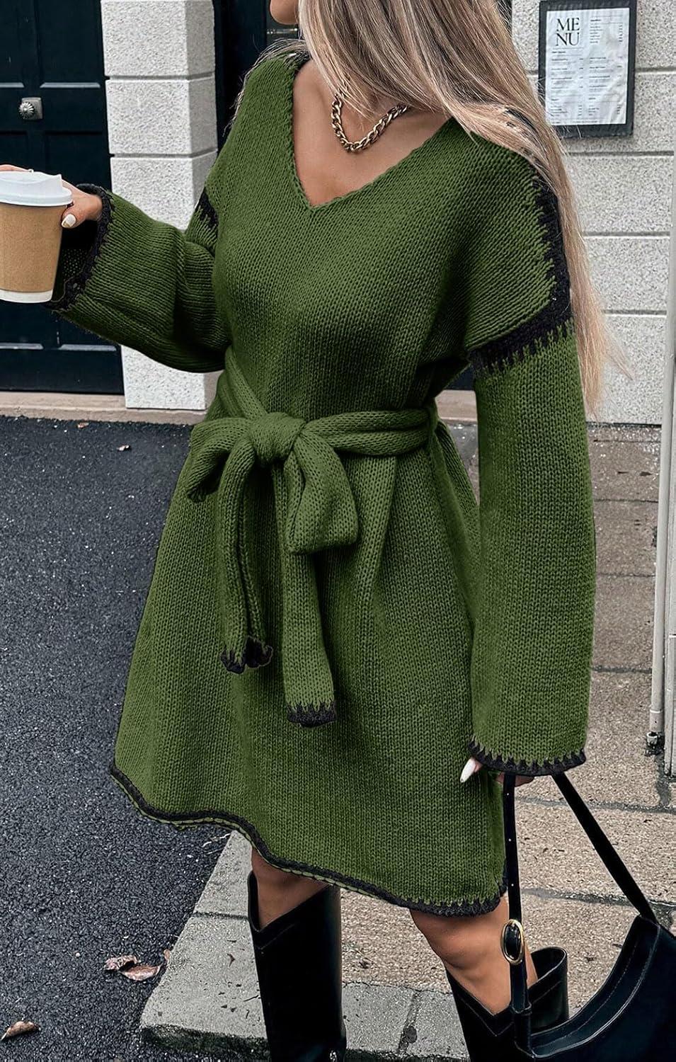 Causal Loose Straight Fit Sweater Dress for Women Fall 2025 Outfit Contrast Jumper Knit Sweater with Belt/ Tunic length sweater dress/ Casual loose fit mini knit dress/ Contrast trim fall outfit with belt/ Size Tips: S=US 4-6, M=US 8-10, L=US 12-14, XL=US 16-18, XXL=US 20; Constructed with comfort material, this contrast trim women sweater dress flexibility to accommodate various body shapes and sizes, effortlessly providing a flattering fit/ Tunic Sweater Dress: This knee length women sweater dress featuring straight fit silhouette, women casual loose fit sweater dress with belt for a fall fashion outfits. Wear it alone, or layering an overcoat with boots for a chic look/ Contrast Trim Jumper Sweater: Chic women stitching contrast edge design effortlessly make this women sweater midi dress special, color block sweater also will visually beautifully sculpting your figure/ Versatile Sweater Dress for Women: Black contrast color sweater dress for women casual outfits/ Long sleeve v neck midi sweater dress for women 2025 fall outfits/ Women fall sweater causal business outfits/ Straight loose fit knit dress for women party outfits/ Basic knit dress for women long winter pullover sweater tops