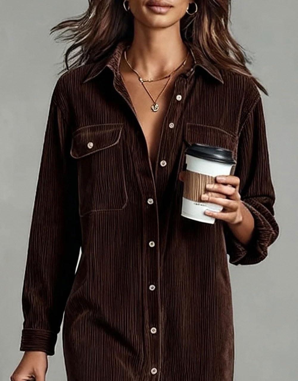 CHARTOU Corduroy Long Sleeve Dress for Women Fall Winter Button Down Midi Dress with Pocket(Coffee)