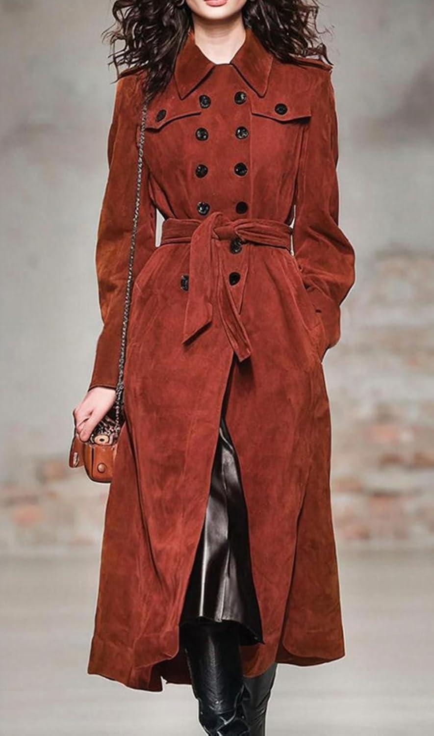 CHARTOU Faux Suede Jacket For Women Long Winter Coats Elegant Double Breast Trench Overcoat with Belt(Red Brown)