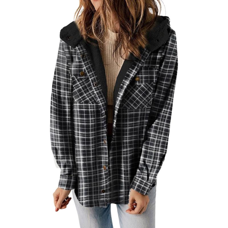 CHARTOU Fleece Jacket Women Plaid Shacket Sherpa Lined Jacket Flannel Fuzzy Coat Winter Hooded Button Overcoat(Black B)