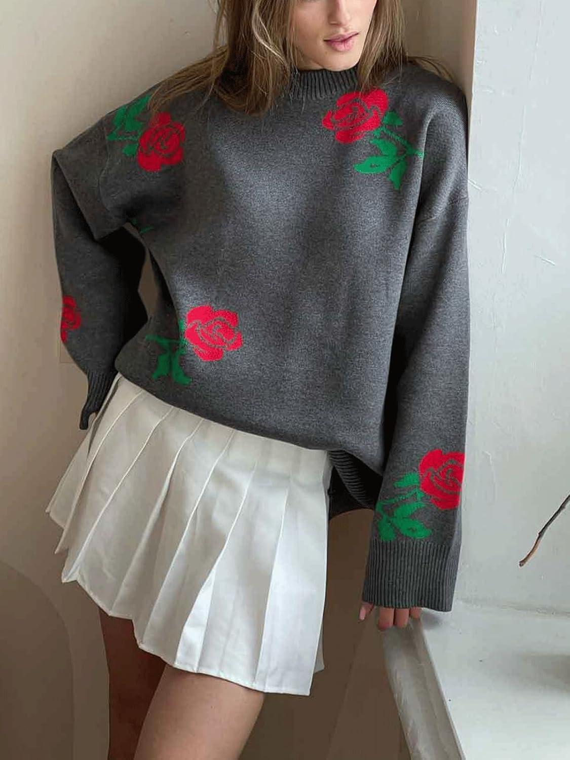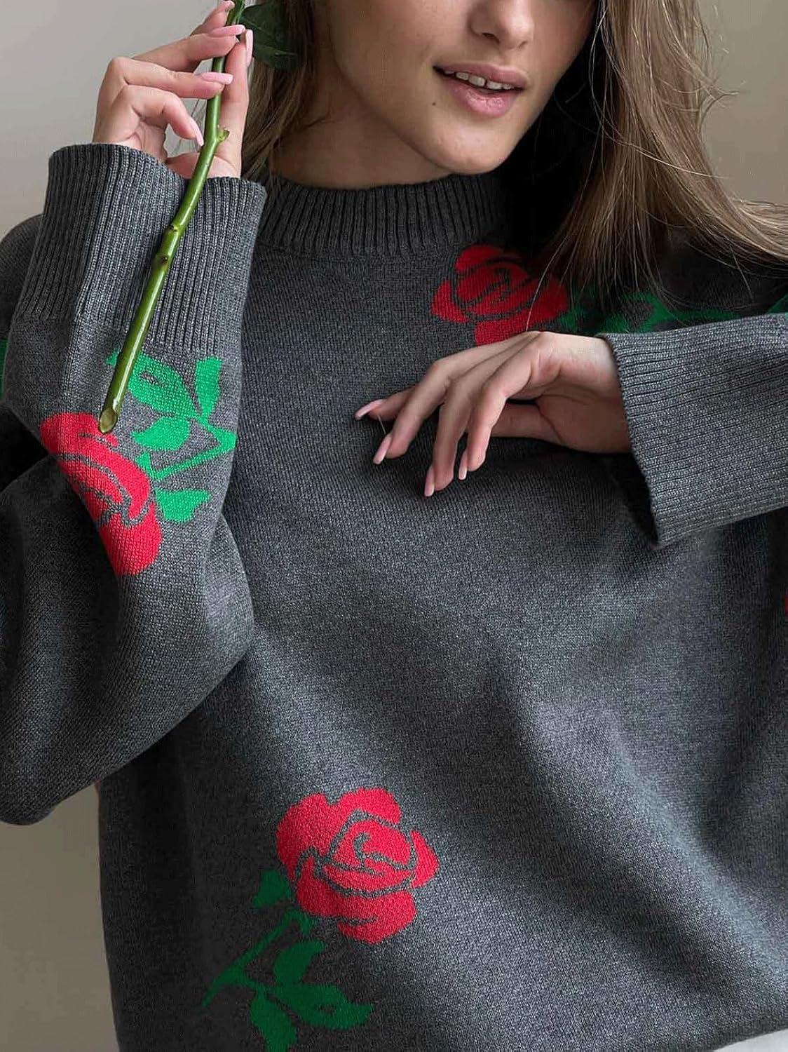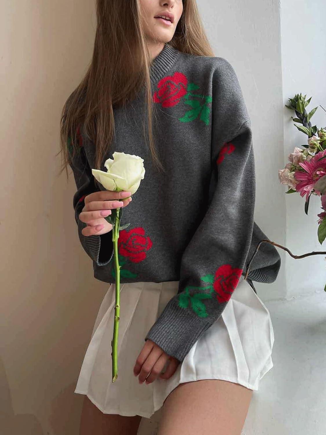 CHARTOU Floral Sweaters for Women Crewneck Long Sleeve Pullover Sweater Casual Oversized Rose Print Cardigan(Grey)