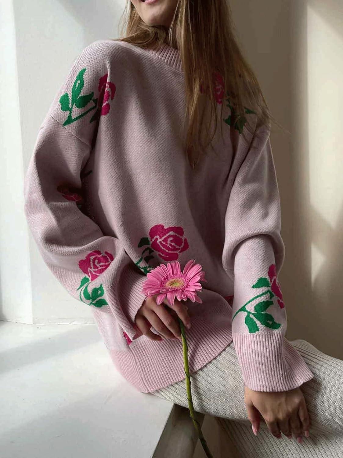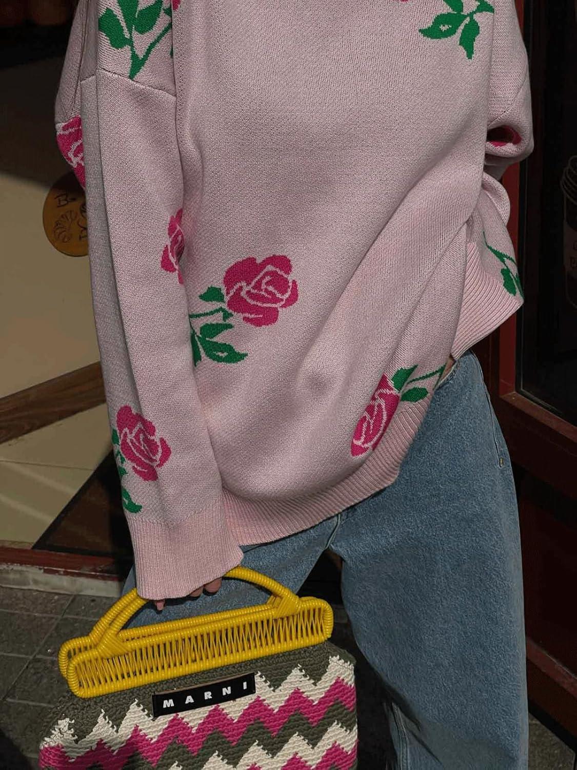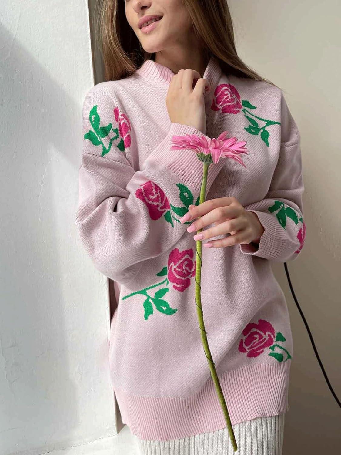 CHARTOU Floral Sweaters for Women Crewneck Long Sleeve Pullover Sweater Casual Oversized Rose Print Cardigan