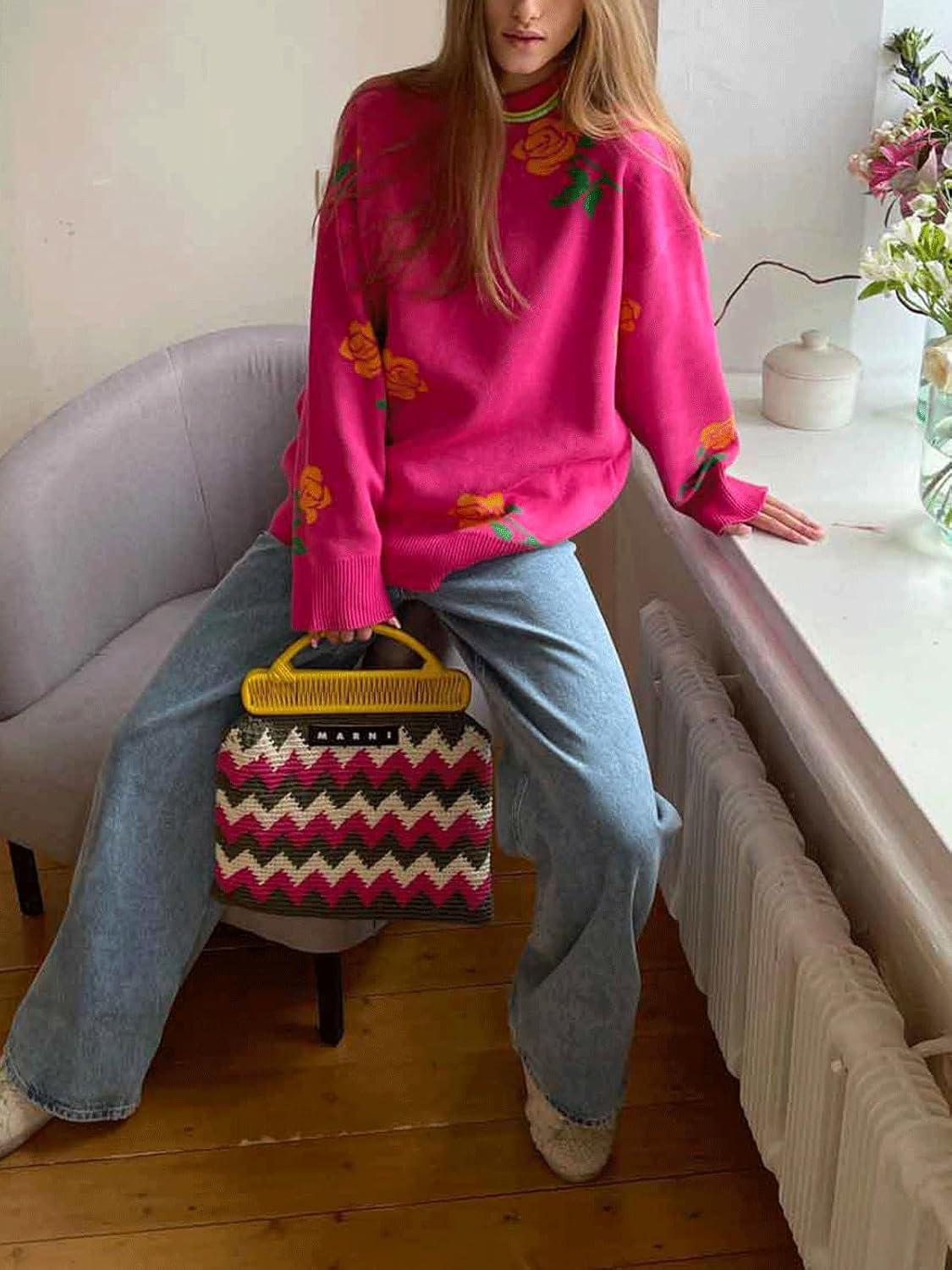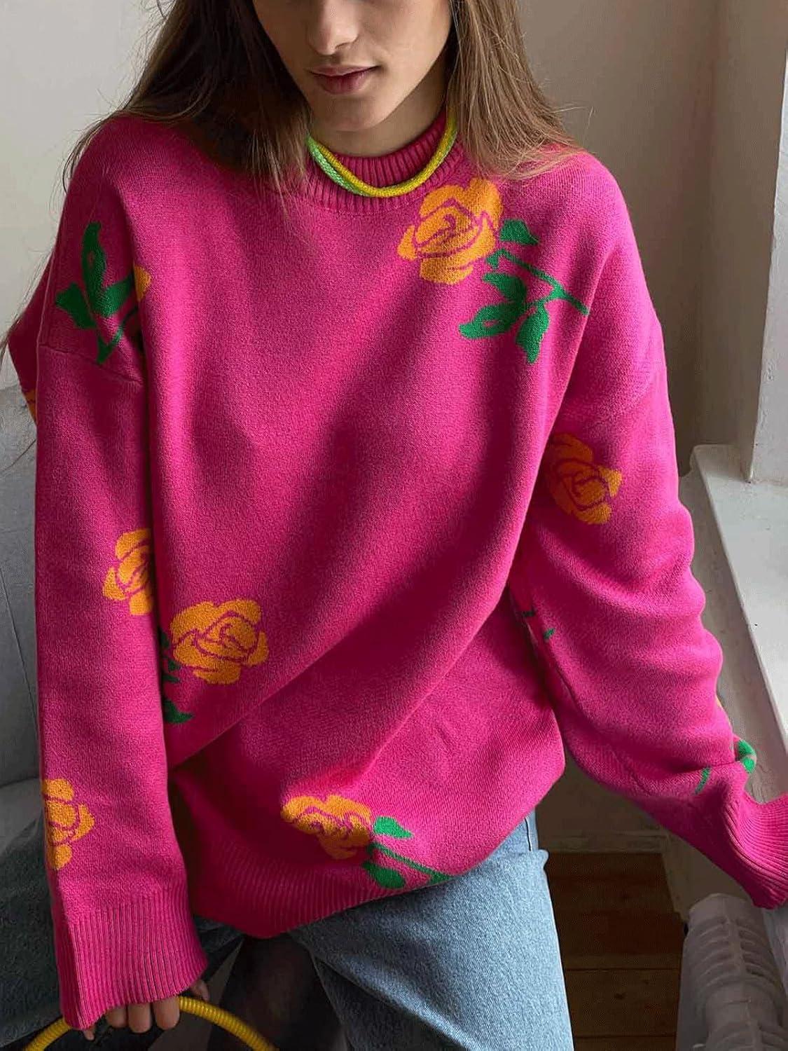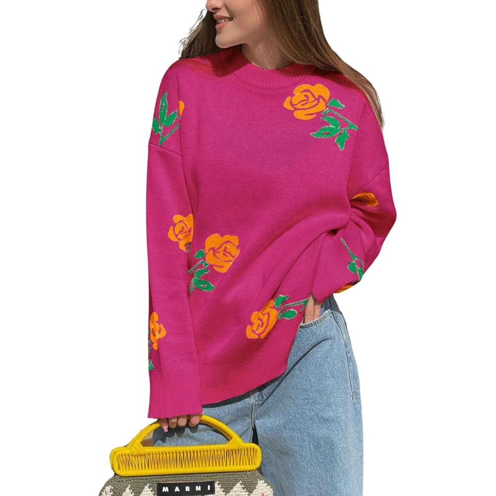 CHARTOU Floral Sweaters for Women Crewneck Long Sleeve Pullover Sweater Casual Oversized Rose Print Cardigan(Rose)