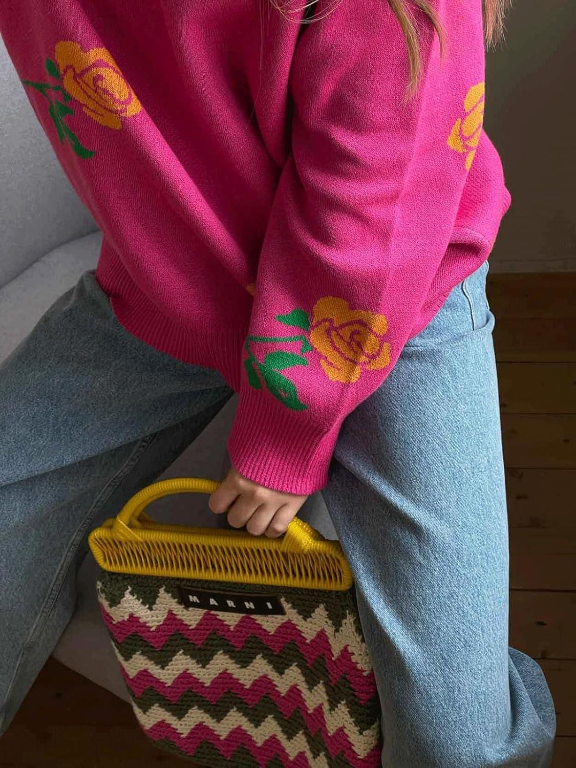 CHARTOU Floral Sweaters for Women Crewneck Long Sleeve Pullover Sweater Casual Oversized Rose Print Cardigan(Pink)