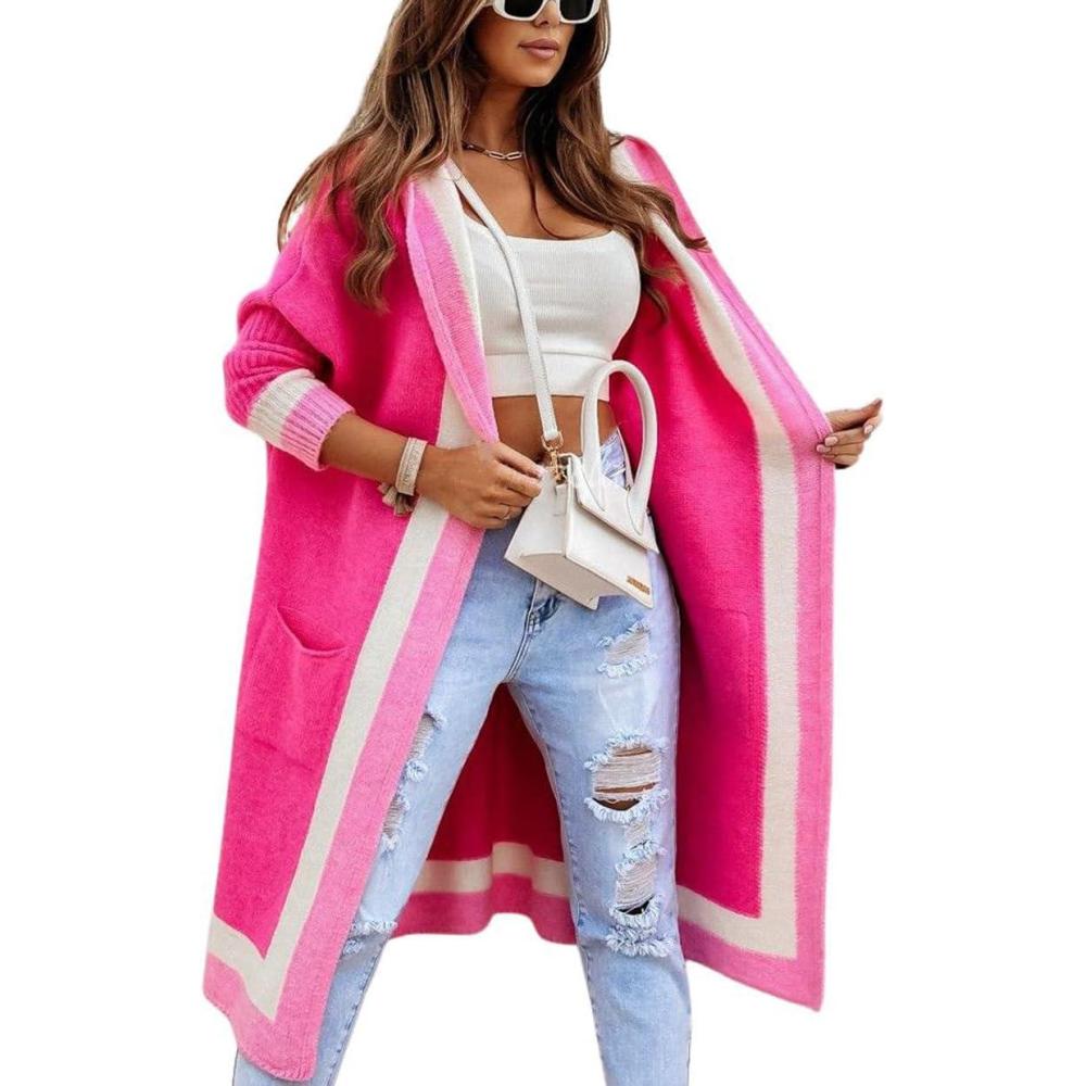 CHARTOU Hooded Long Knit Cardigan For Women Blcoked Color Long Sweatshirt Jacket Sweater; Oversized hooded long cardigan sweater/ Color block long jacket sweater/ Sweatshirt duster sweater with pockets; Highlights: Long open front cardigan sweater for women,open front design allows for easy layering over different outfits, whether dressing up for causal day out or lounging at home; Color block combination coupled with the tapered sleeves and hood; Trendy Design: This long cardigan jacket sweater if crafted with hoodies, semi batwing arms, kimono sleeves, oversized slouchy fit, 2 hand pockets, falls below the knee length, color block longline cardigan; Hoodies sweatshirt style jacket sweater adding a touch of sporty, and athleisure; Color-Apricot, Green, Pink, and Rose; Fall Winter Long Cardigan: This 2024 fall color blocked oversized cardigan jacket is fitted for women and ladies as fall winter casual light cardigan jacket, fashion street wear sweatshirt cardigan, y2k colorful rainbow cardigan jacket, weekend lounging at home long knit jacket, vacation cozy loose fit sweater coat, edgy cardigans winter clothes for women etc