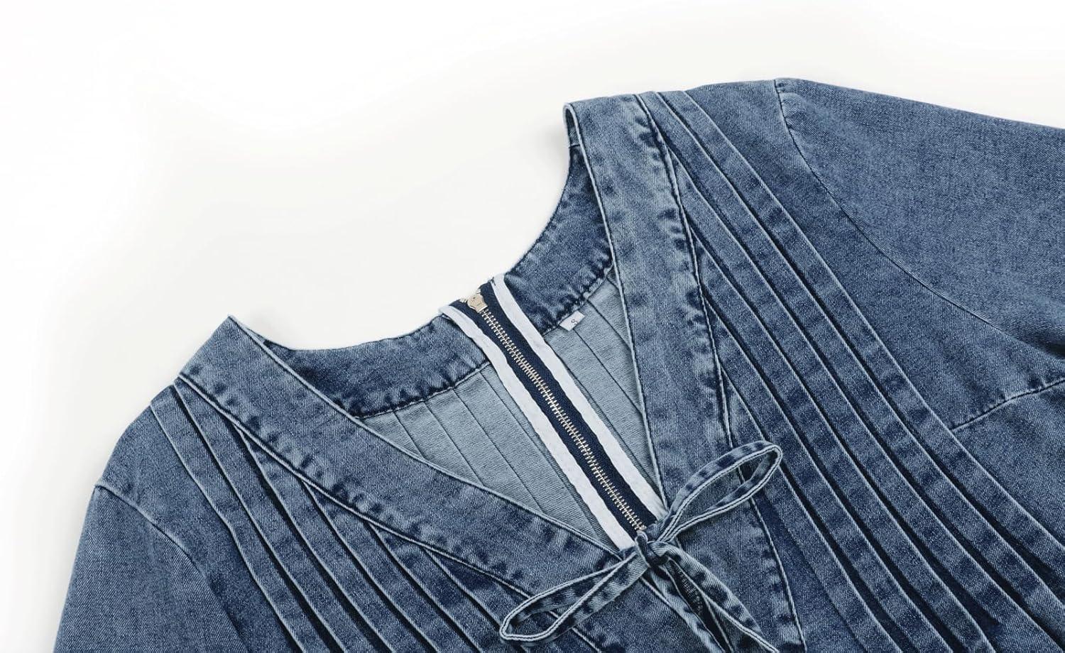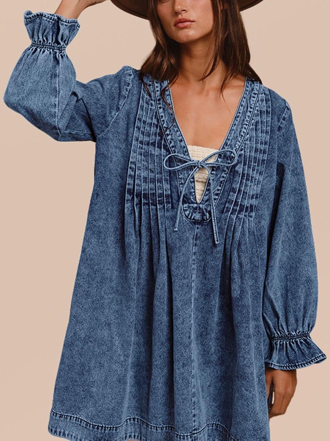 CHARTOU Long Sleeve Jean Dresses for Women 2024 Trendy Smocked Babydoll Bow Tie Front Denim Dress Summer(Blue)