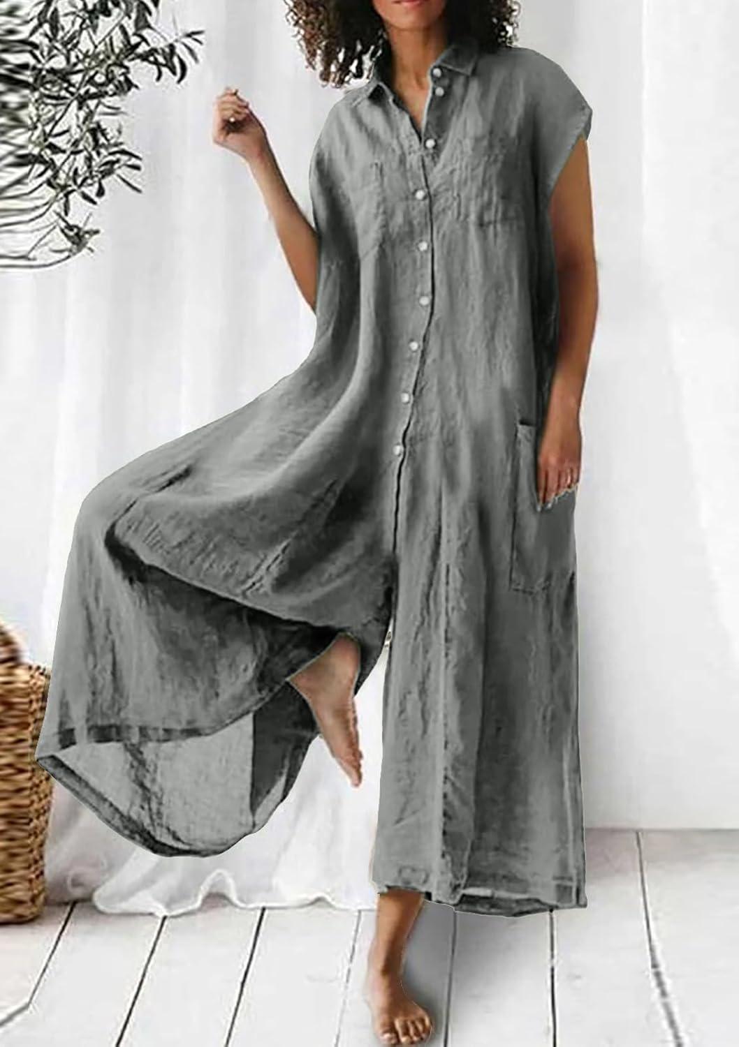 CHARTOU Loose Wide Leg Jumpsuit Women Jumper Linen Palazzo Pants Romper Summer Button Sleeveless Lounge Jumpsuit(Grey)