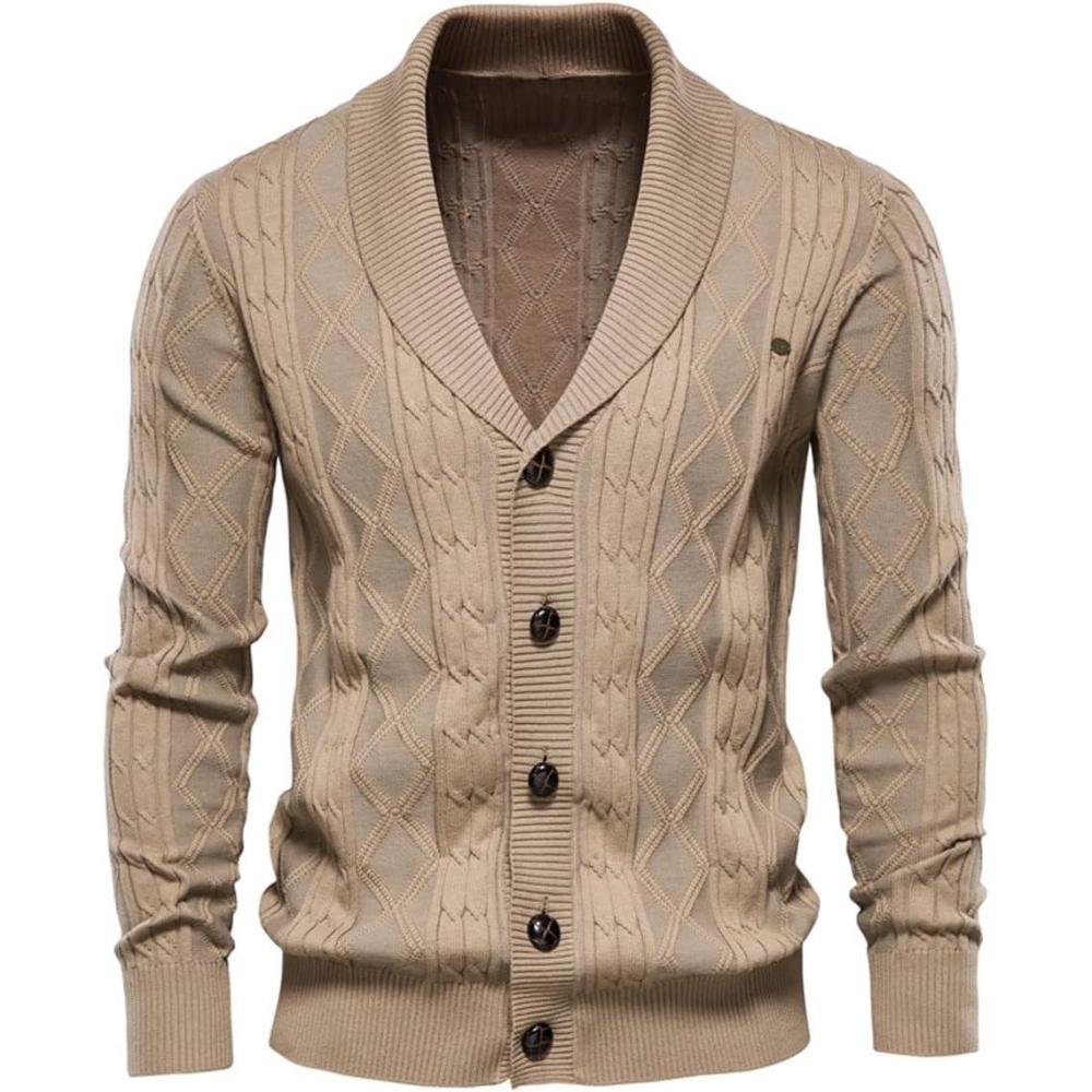CHARTOU Men Cable Knit Cardigan Sweater with Button Down Shawl Collar Knitted Sweater Jacket Knitwear(Khaki)