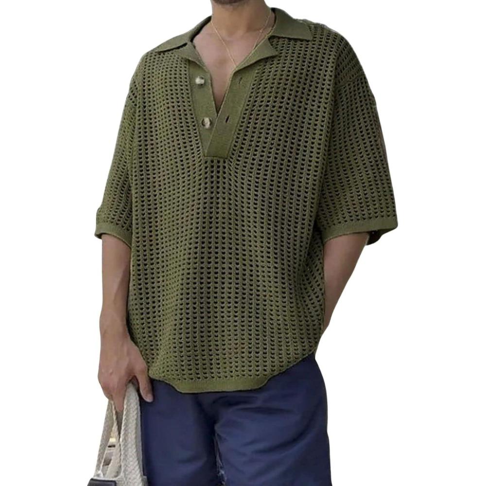 CHARTOU Men Casual Crochet Knit Polo Shirt Short Sleeve Collared T Shirt Summer Tees Fishnet Shirt(Armygreen)