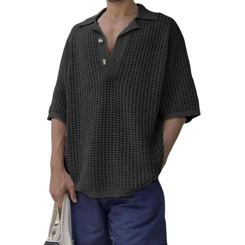 CHARTOU Men Casual Crochet Knit Polo Shirt Short Sleeve Collared T Shirt Summer Tees Fishnet Shirt(Black)