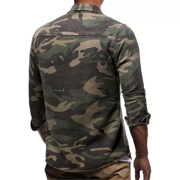 Features: Regular fit/ Turn down lapel/ Snap-button style/ Long sleeves with buttoned cuffs/ Army green camouflage print/ 2 chest pockets/ Curved hem