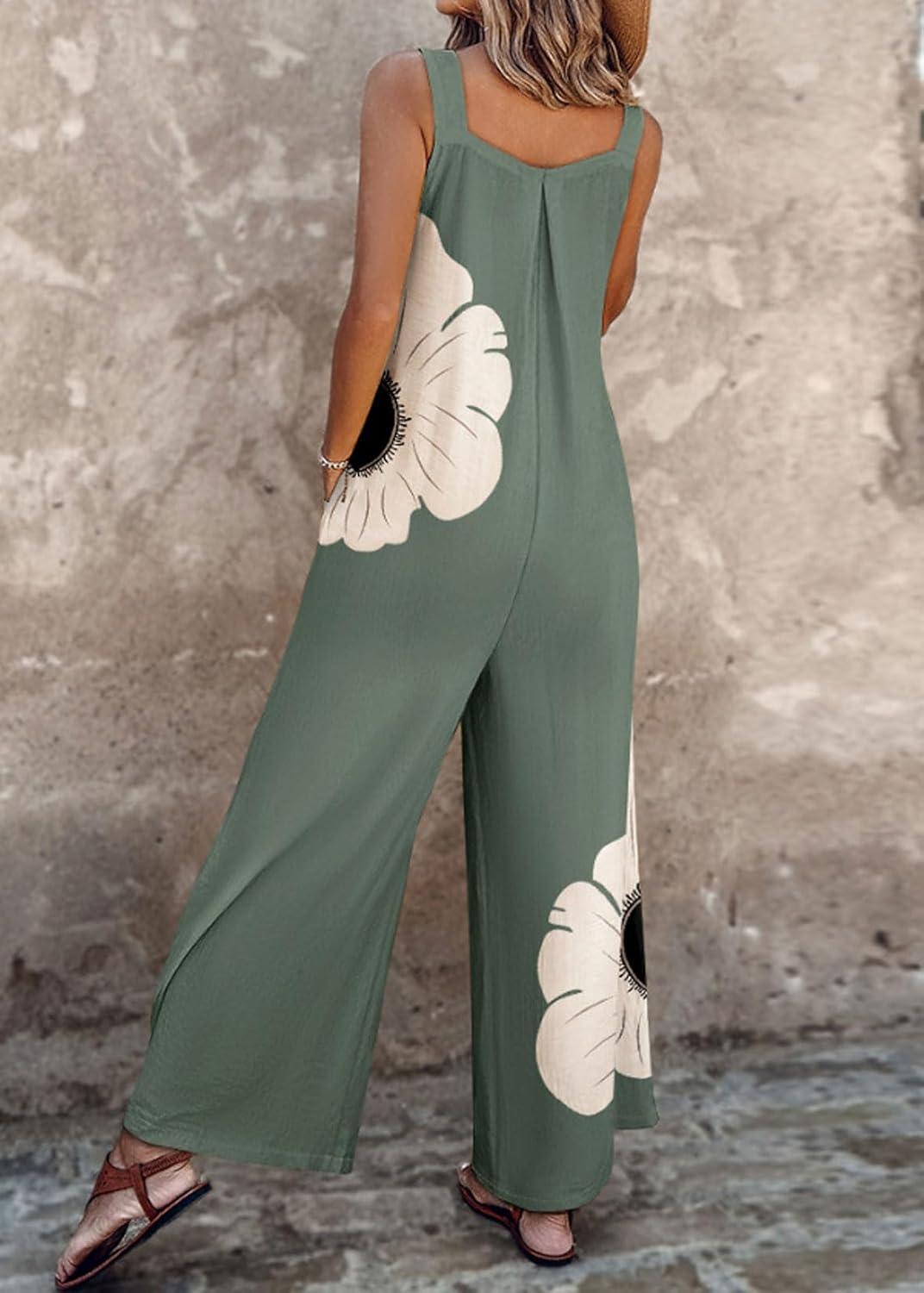CHARTOU Summer Casual Boho Jumpsuits for Women Loose Wide Leg Overalls Floral Printed Baggy Romper(Green)