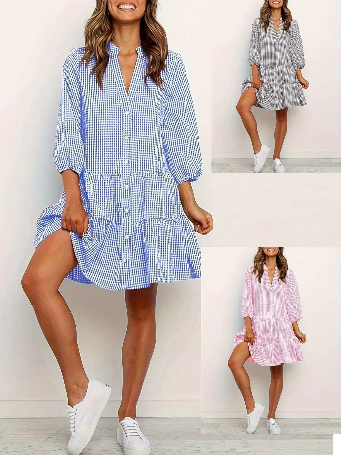 Casual Shirt Dress for Women/ Plaid Summer Shirt Dress/ Ruffle Midi Dress/ 3/4 Sleeve Loose Summer Dress