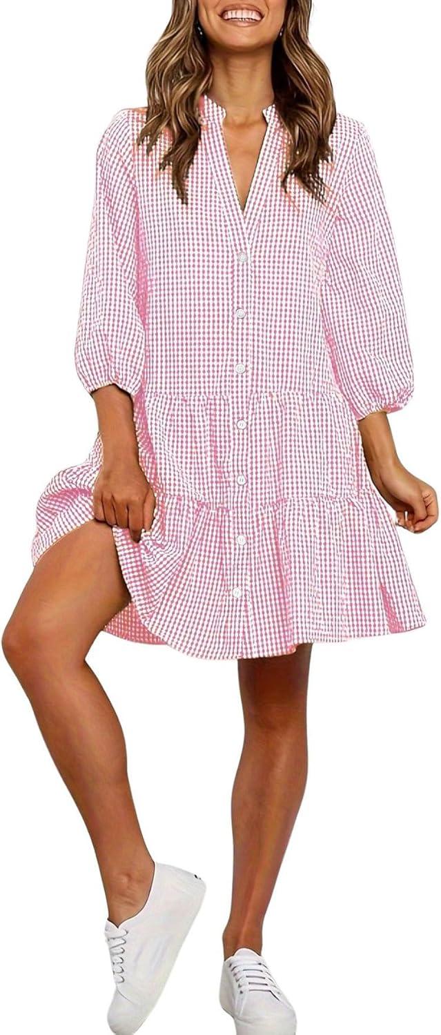 Casual Shirt Dress for Women/ Plaid Summer Shirt Dress/ Ruffle Midi Dress/ 3/4 Sleeve Loose Summer Dress