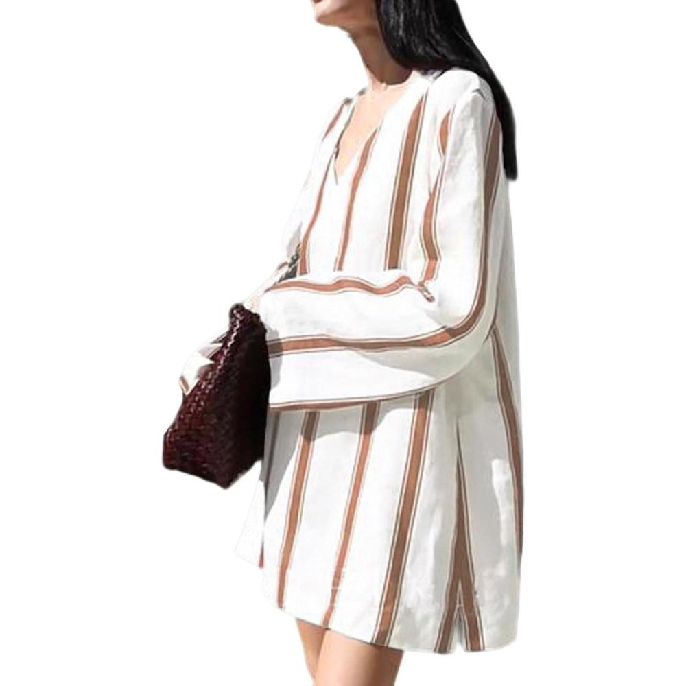 CHARTOU Summer Stripe Tunic Dress V Neck Shirt Long Sleeve Casual Loose Fit Sundress with Pockets; Relaxed fit tunic dress/ Stripe cotton linen summer sundress/ Long Sleeve v neck casual loose short dress; Slouchy Tunic Shirt Dress: Casual loose fit cotton linen summer sundress with tunic length, easy to slip on and off; Design: Pull on closure/ Show your neckline and offer comfort fit with v neck design during summer/ Chic stripes pattern will never out of date/ Long sleeve summer mini dress/ Two handy pockets for essential storage/ Breathable cotton linen dress; Occasion: Airy cotton linen striped dress for your summer cruise outfits; Relaxed long sleeve tunic shirt for stress-free lounging around dress; Casual loose fit stripes mini dress for summer maternity petite stripe dress; Stripes tropical outfits for summer beach coverup dress; Size Tips: S=US 4-6, M=US 8-10, L=US 12-14, XL=US 16-18; Out stripes tunic shirt dress crafted from lightweight cotton linen material, summer long sleeve tunic dress combine comfort and style