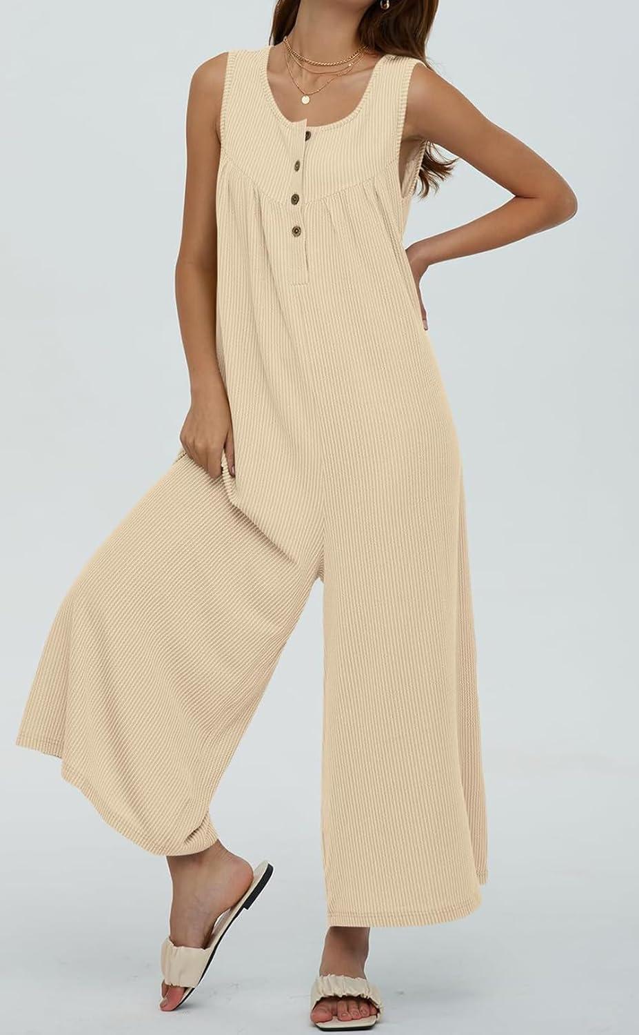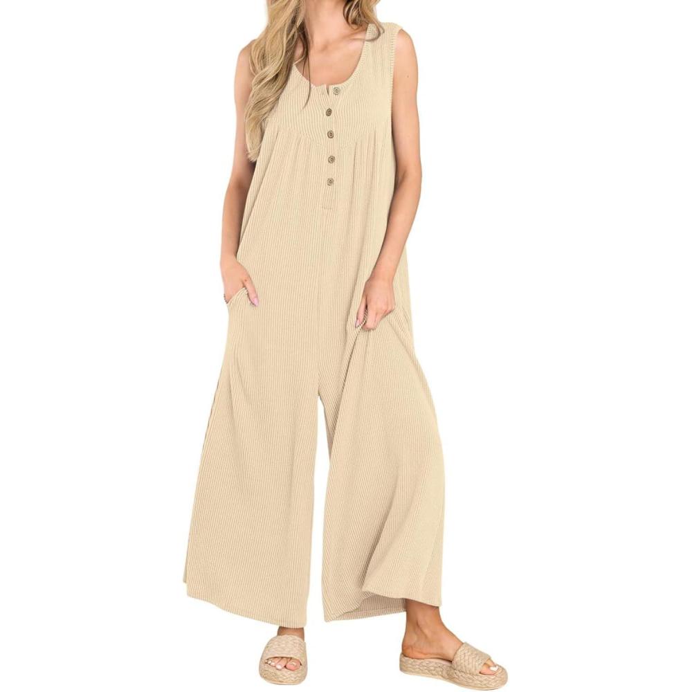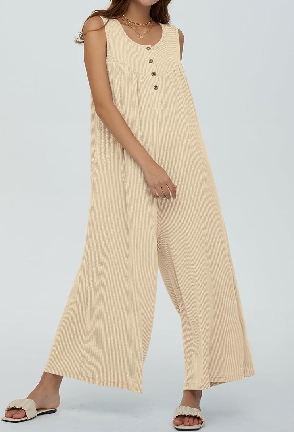 Get the CHARTOU Summer Striped Jumpsuit for Women Wide Leg Jumpsuit Sleeveless Long Romper Button Down Baggy Overalls Jumper(Apricot) you want at a discounted price during our markdown sale event.