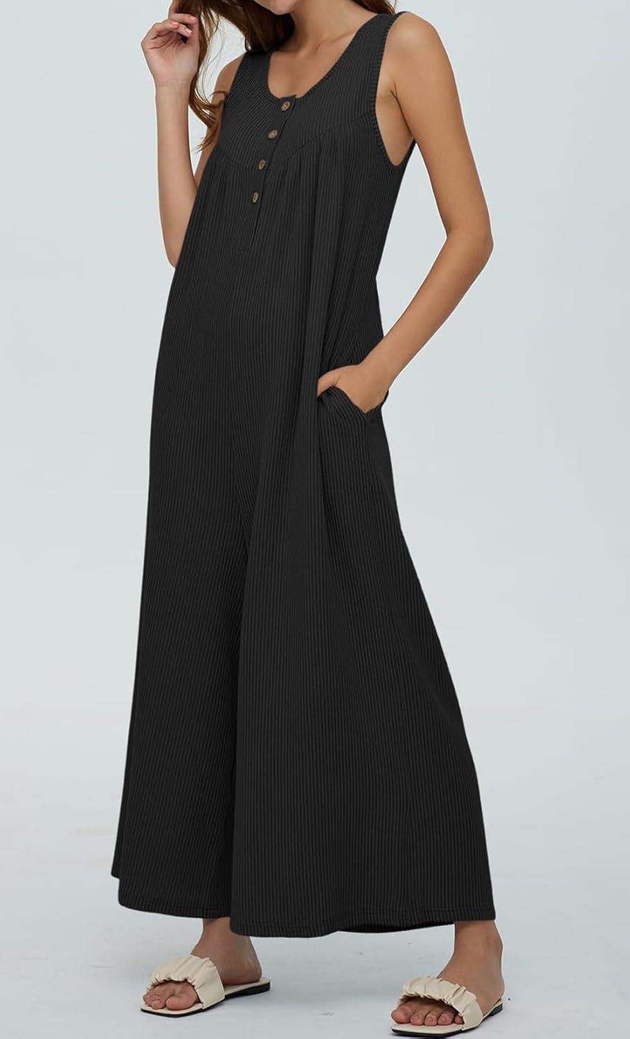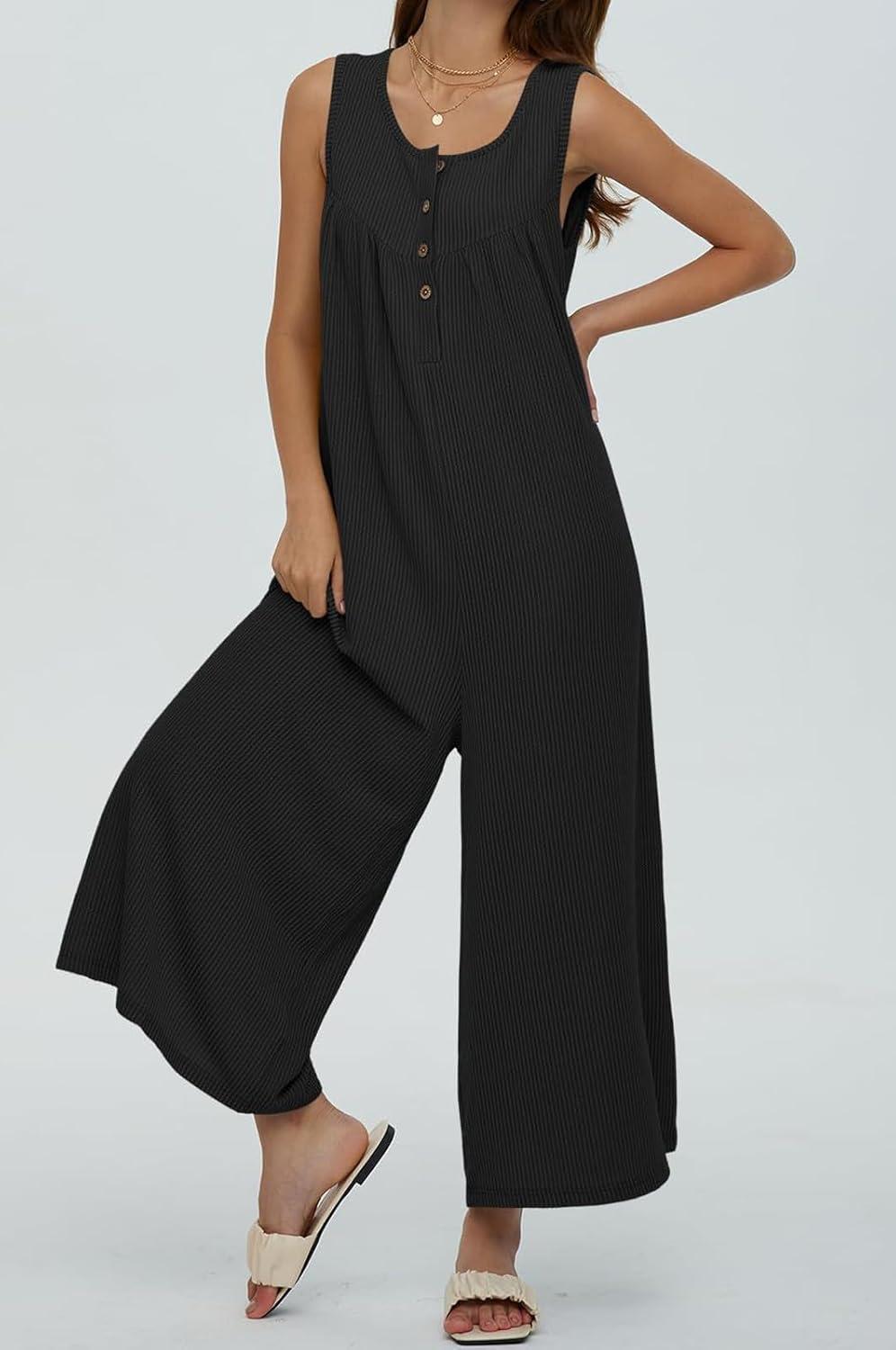CHARTOU Summer Striped Jumpsuit for Women Wide Leg Jumpsuit Sleeveless Long Romper Button Down Baggy Overalls Jumper(Black)