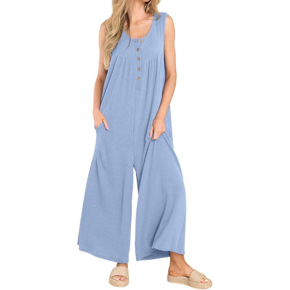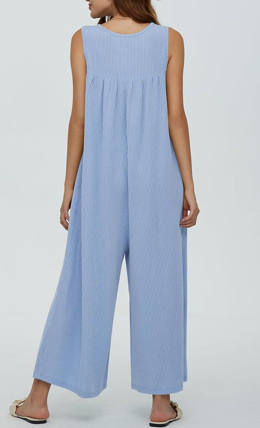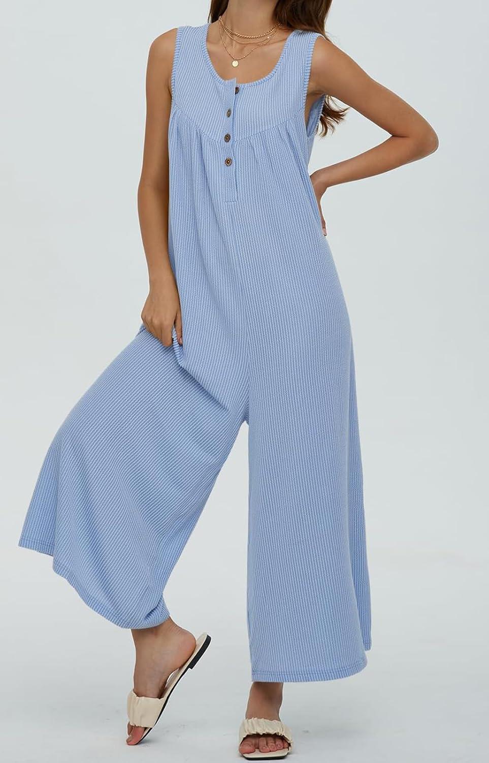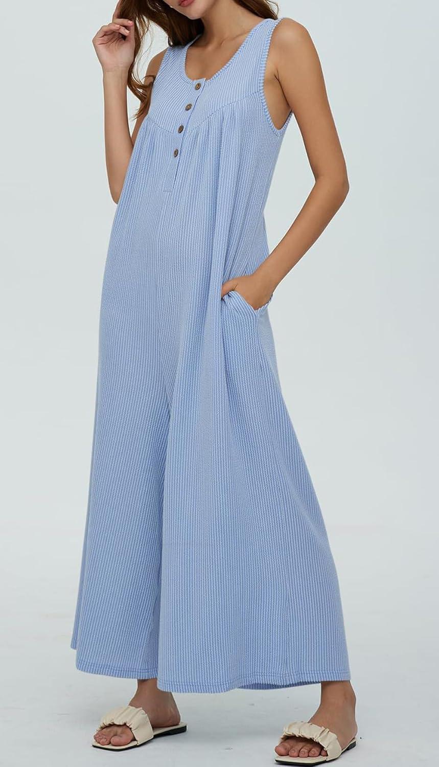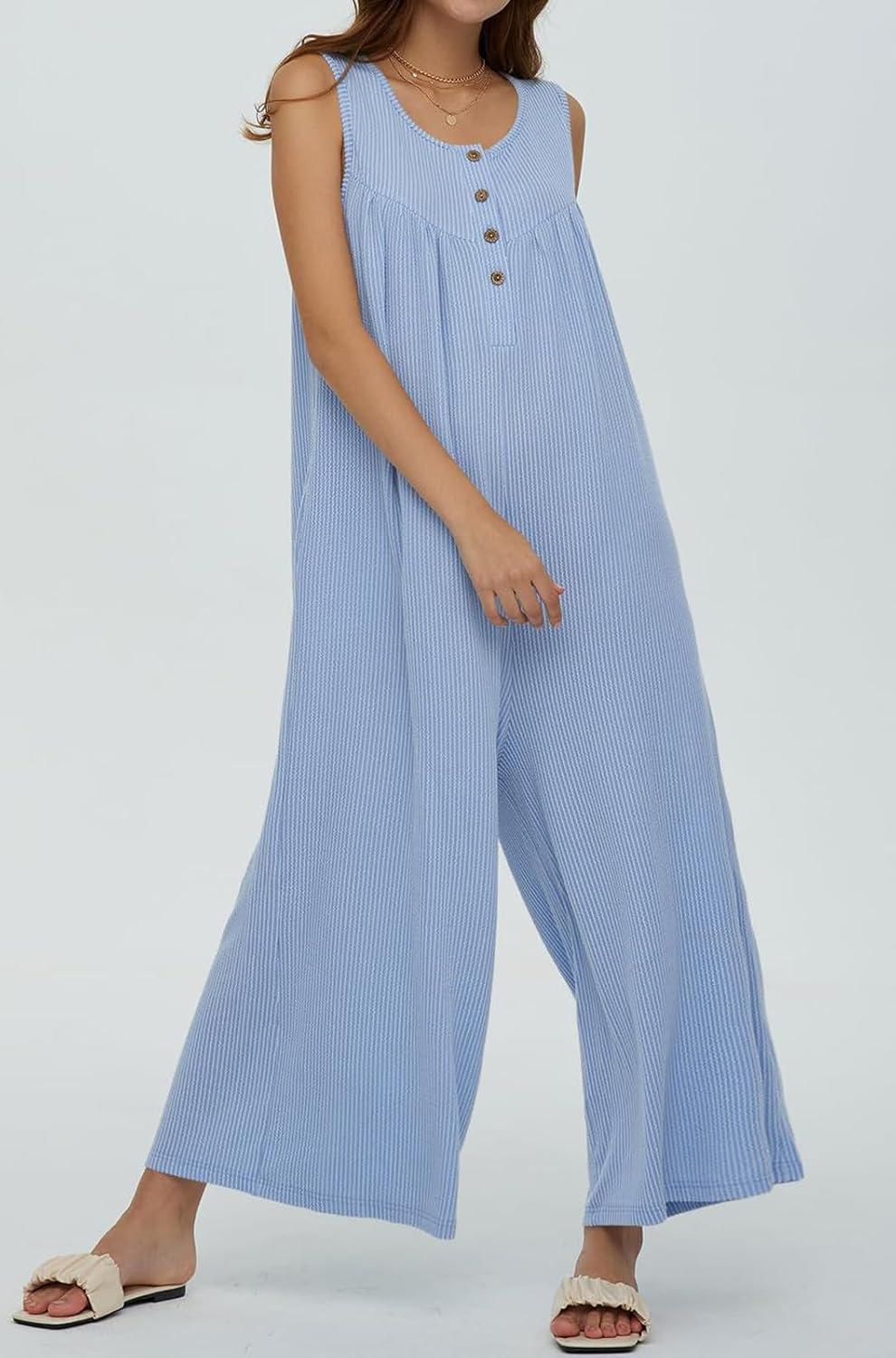 CHARTOU Summer Striped Jumpsuit for Women Wide Leg Jumpsuit Sleeveless Long Romper Button Down Baggy Overalls Jumper(Blue)
