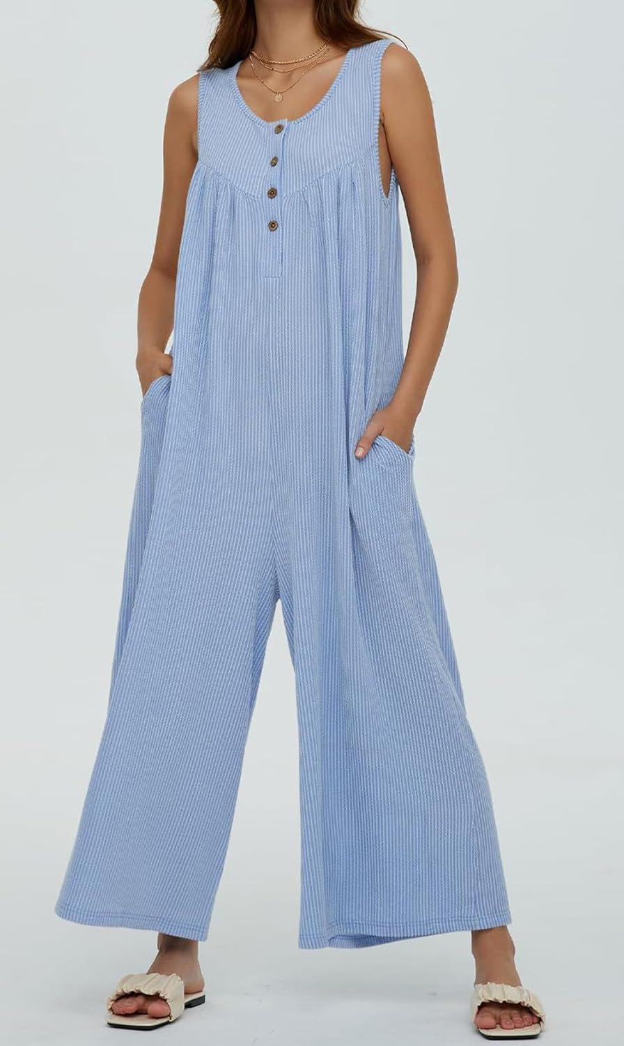 CHARTOU Summer Striped Jumpsuit for Women Wide Leg Jumpsuit Sleeveless Long Romper Button Down Baggy Overalls Jumper Casual baggy striped overalls for women loose fit Lightweight and thin fabric, breathable and comfortable to wear as summer jumpsuits 【Size Guide for STRIPED JUMPSUIT】—-XS=US 0-2, S=US 4-6, M=US 8-10, L=US 12-14, XL=US 16-18, XXL=US 20-22. Please refer to the body size chart in last picture before purchase. 【SELLING POINTS for SLEEVELESS JUMPSUIT】—– Sleeveless jumpsuit/ Round O neck/ Pinstripe vertical striped jumpsuit for women/ Button down dress overalls outfit/ 2 Side pockets/ Wide leg pants palazzo flowy pants/ Ruffle pleated jumpsuit silhouette/ Color- Blue, navy, grey, black jumpsuit for women, apricot, green jumpsuit women 【VERSATILE ONE PIECE JUMPSUIT】—- Weekend casual striped jumpsuit for women wide leg pants sleeveless jumpsuits loose jumpsuit flowy pants, daily striped overalls loose long rompers, summer jumpsuit striped romper, vacation wide leg overalls jumper wide leg jumpsuits, one piece jumpsuits casual stretchy jumpsuits beach pants baggy overalls lounge wear tshirt romper wide leg overalls oversized tank jumpsuit, pajamas maternity jumpsuit button down dress flowy jumpsuits dressy, western outfit Sleeveless Jumpsuits For Women Summer Wide Leg Striped Stretchy Casual Tank Long Romper Beach Baggy Overalls