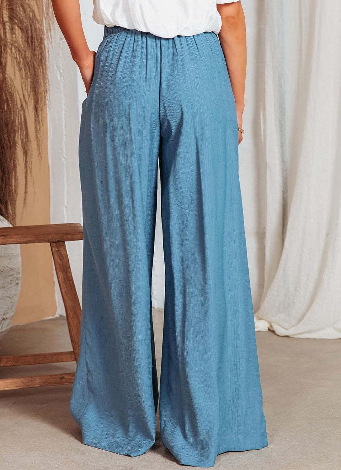 CHARTOU Summer Wide Leg Pants Womens Palazzo Pants Casual Textured Beach Flowy Pants Elastic Waist Pants with Belt(Blue)