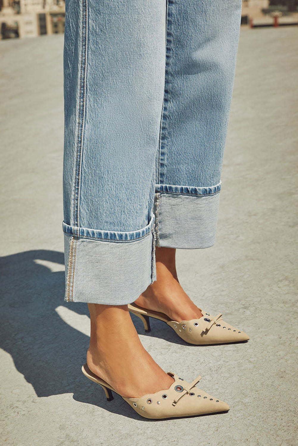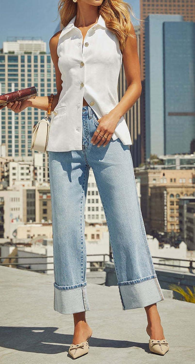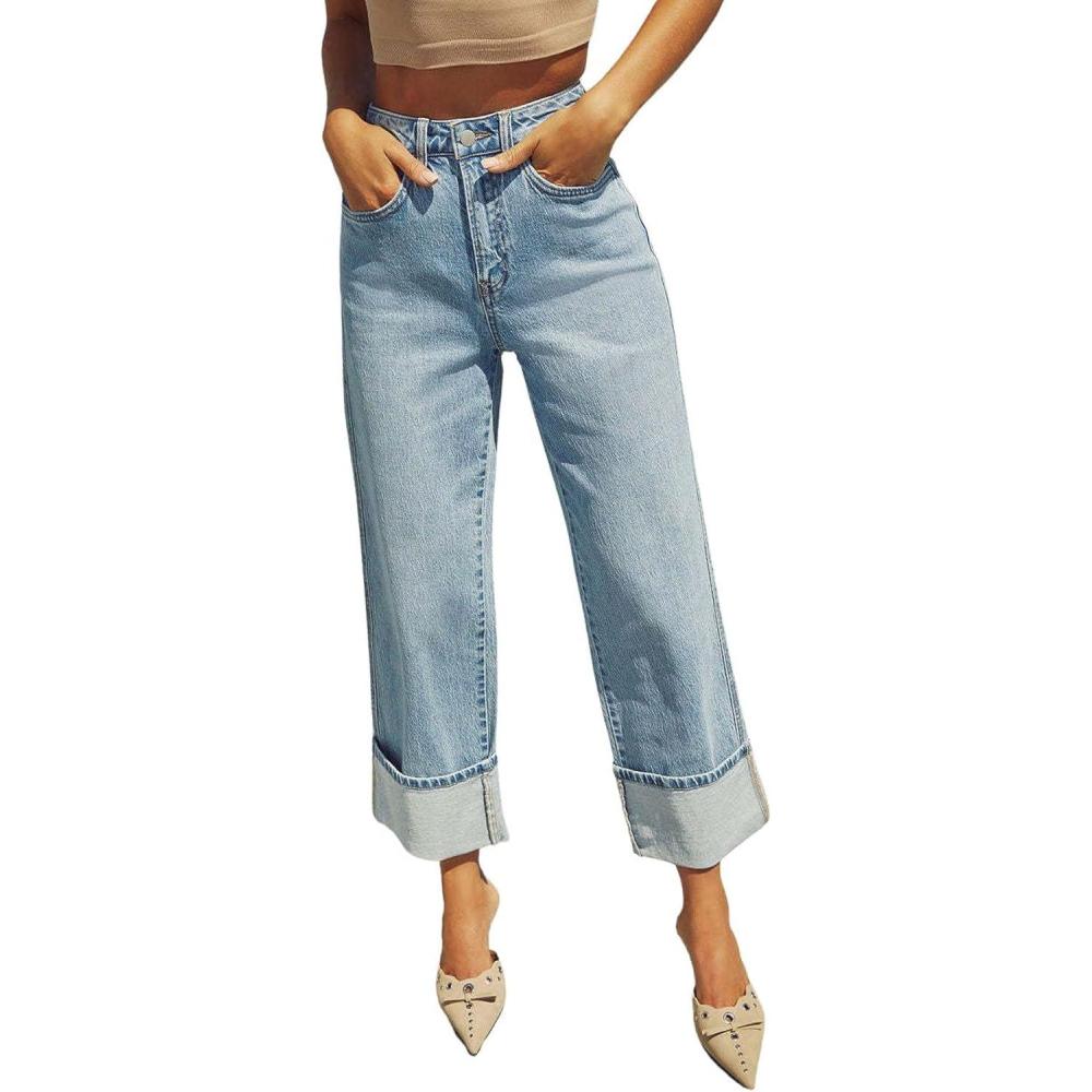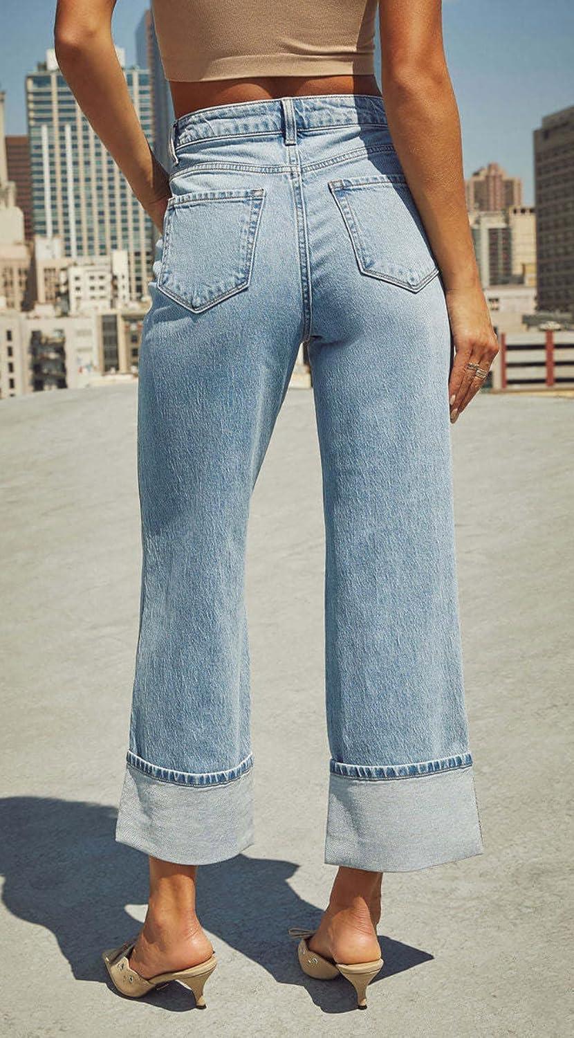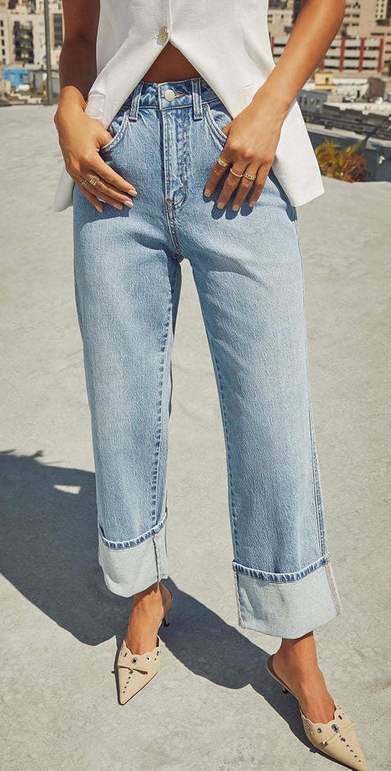 Baggy Boyfriend Jeans/ Wide Leg Denim Pants/ Stretchy High Waist Jeans/ Rolled Up Cuffed Denim Jeans