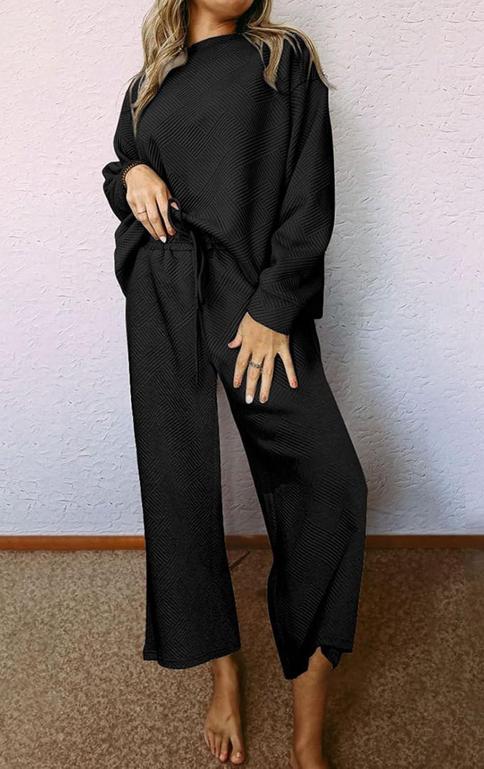 CHARTOU Women 2 Piece Outfit Textured Long Sleeve Blouse Shirt Top Capri Pants Set Tracksuit Lounge Set Lightweight(Black)