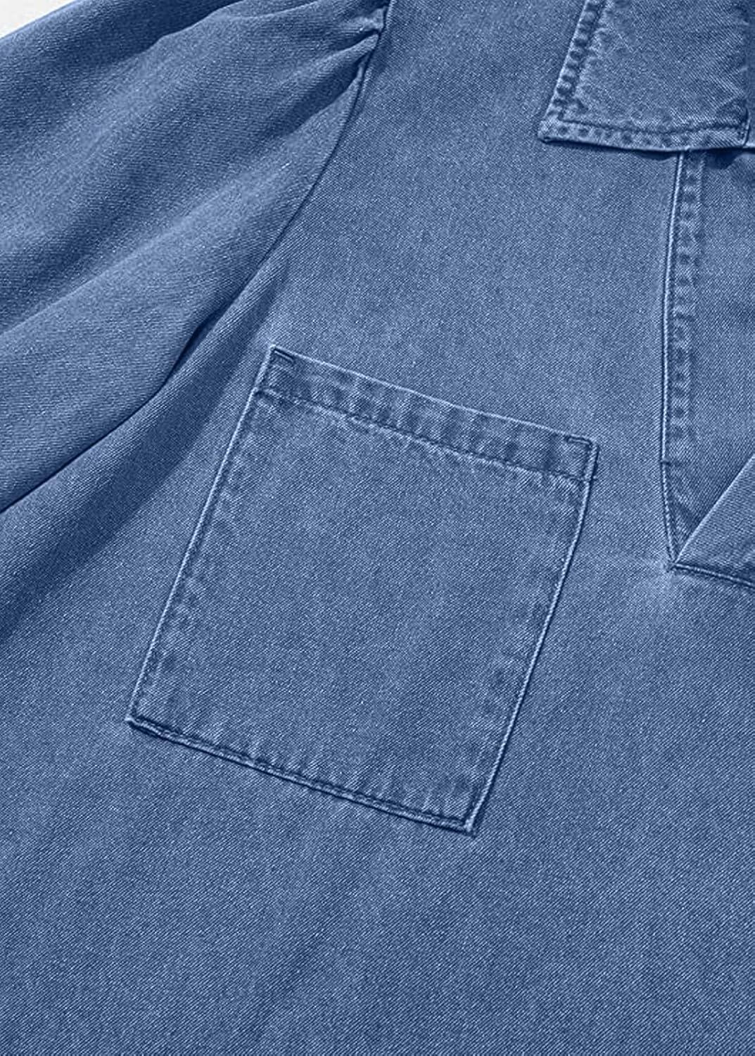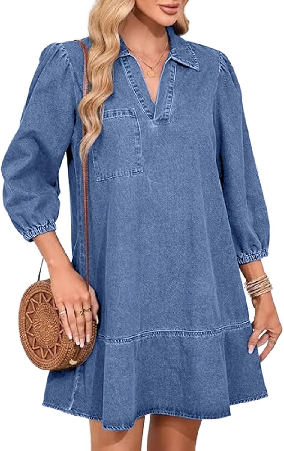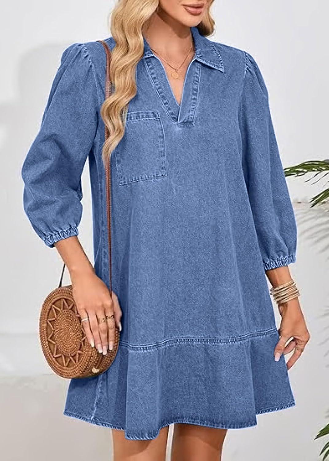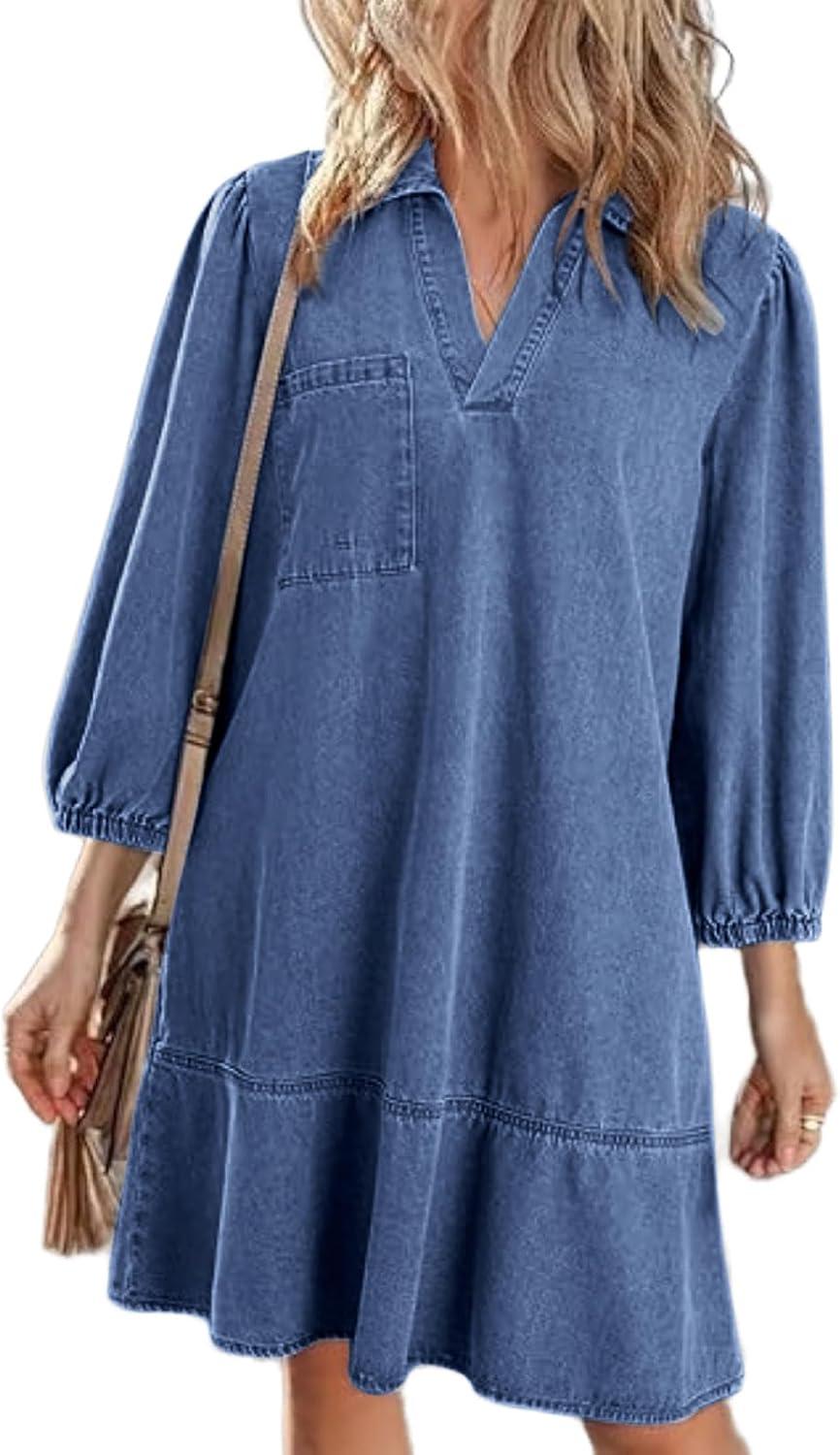 CHARTOU Women 3/4 Sleeve Ruffle Denim Dress Summer Collared V Neck Loose Shirt Jean Dress with Pockets(Blue)
