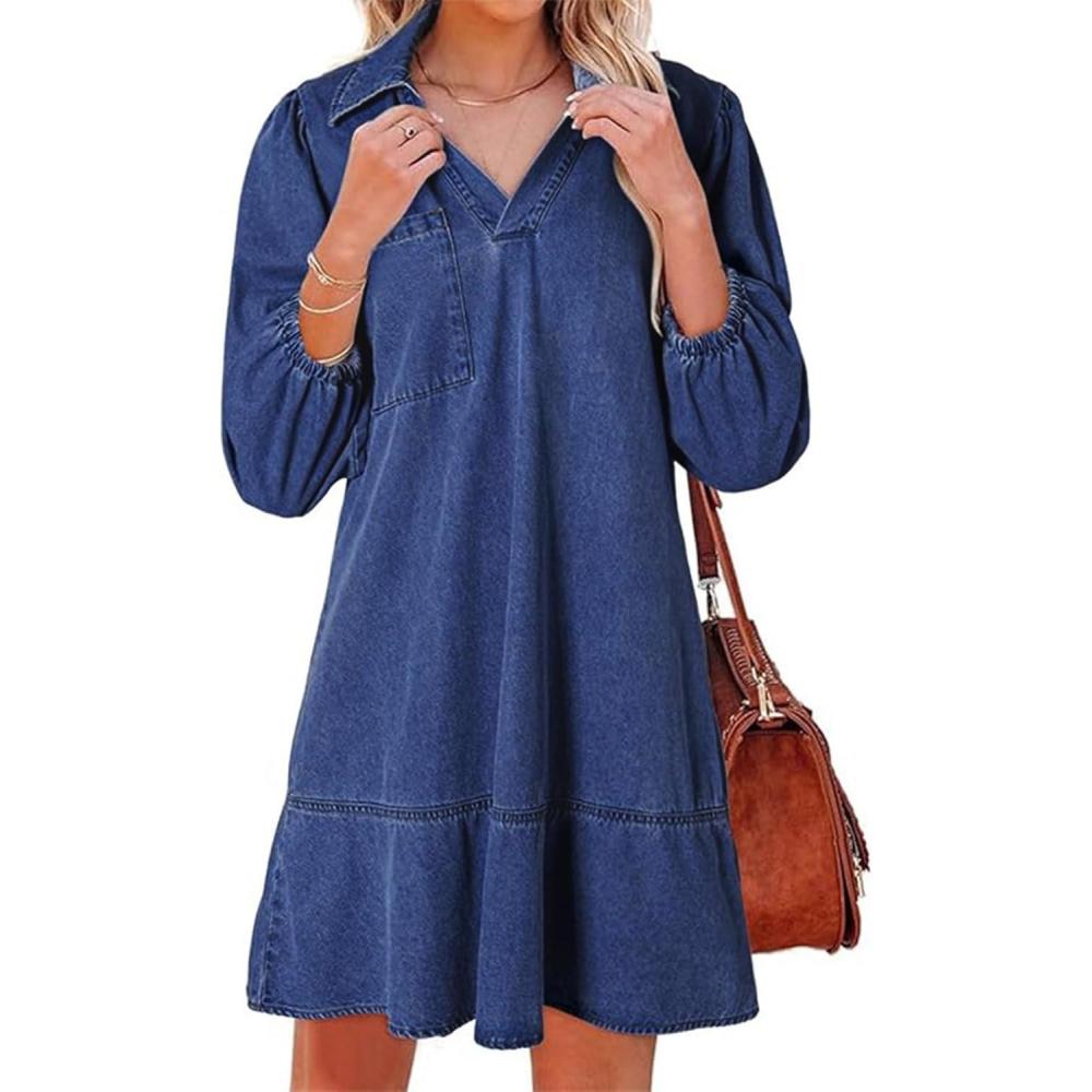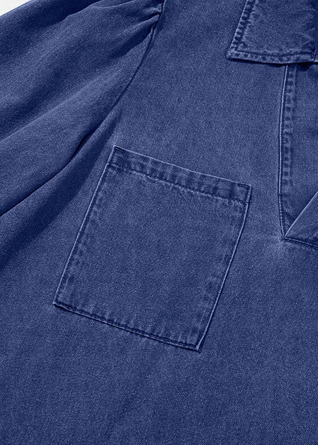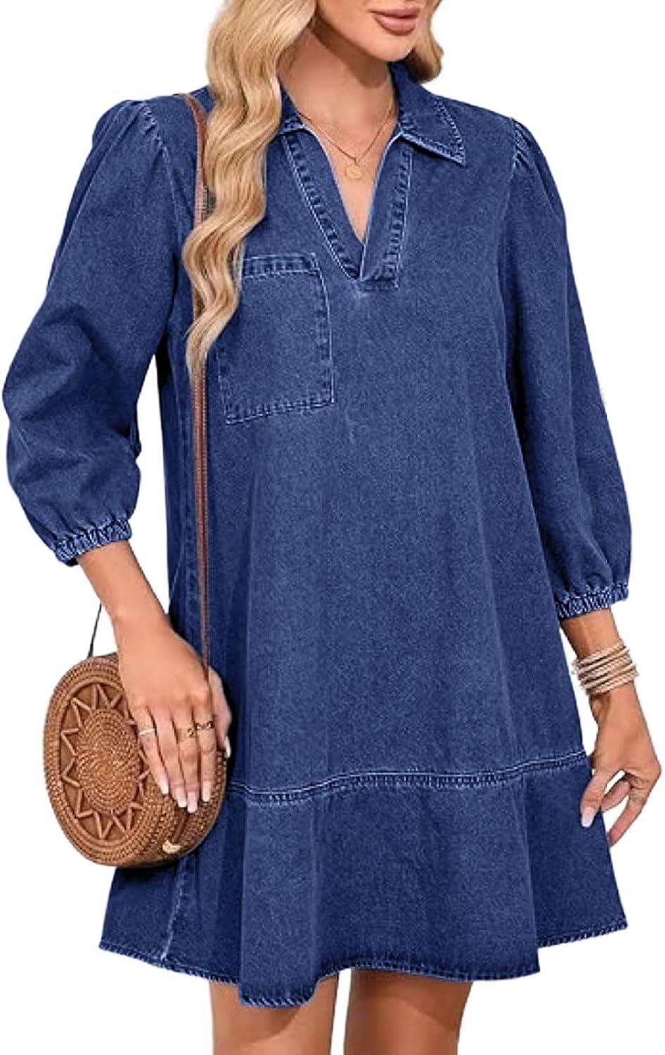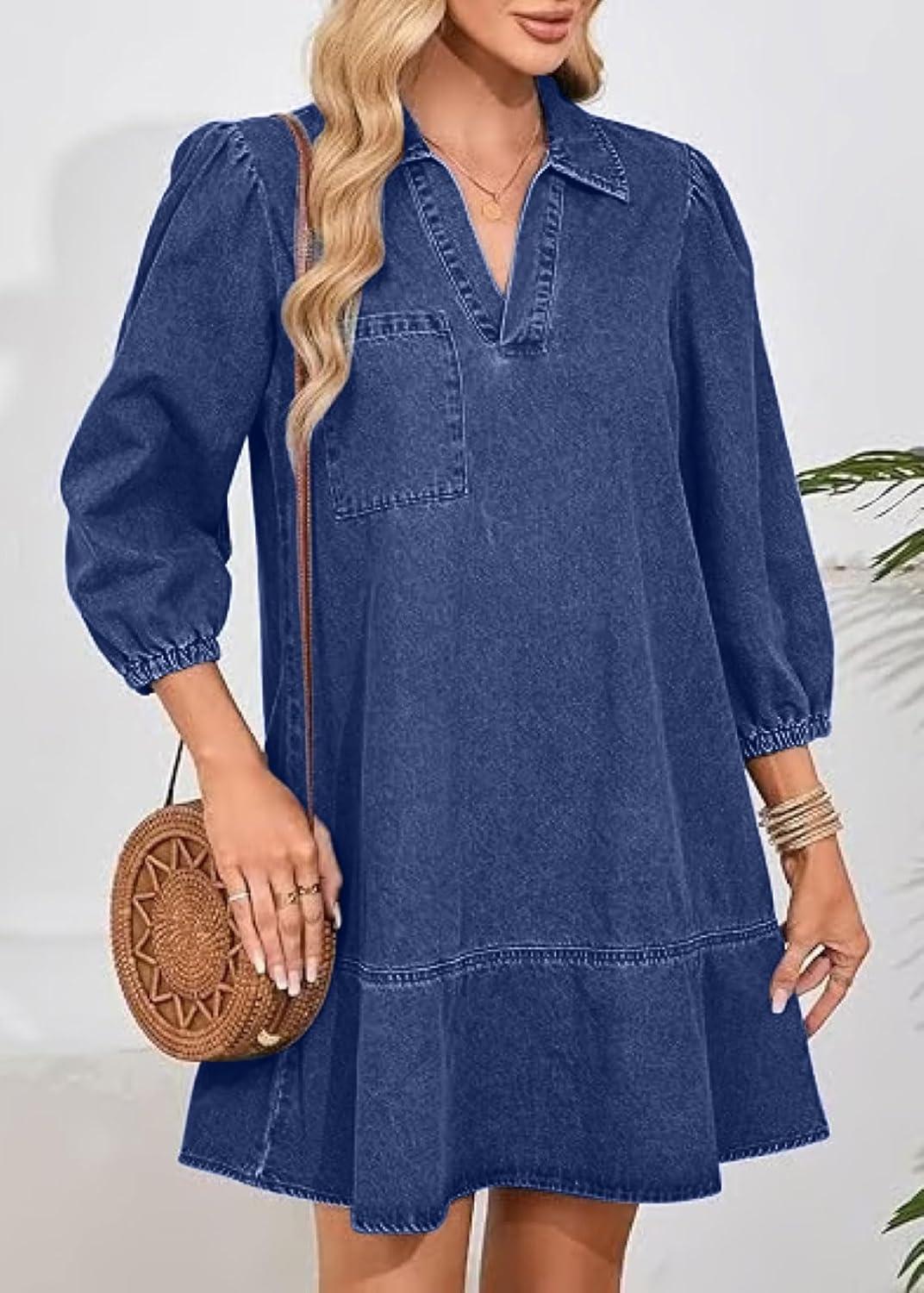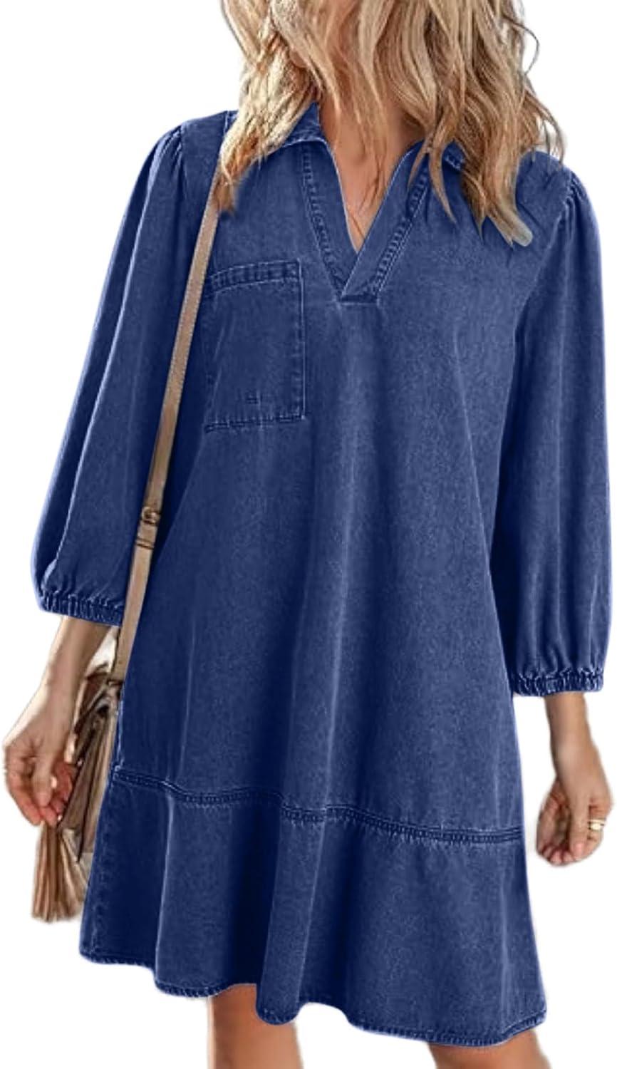 CHARTOU Women 3/4 Sleeve Ruffle Denim Dress Summer Collared V Neck Loose Shirt Jean Dress with Pockets(Dark Blue)
