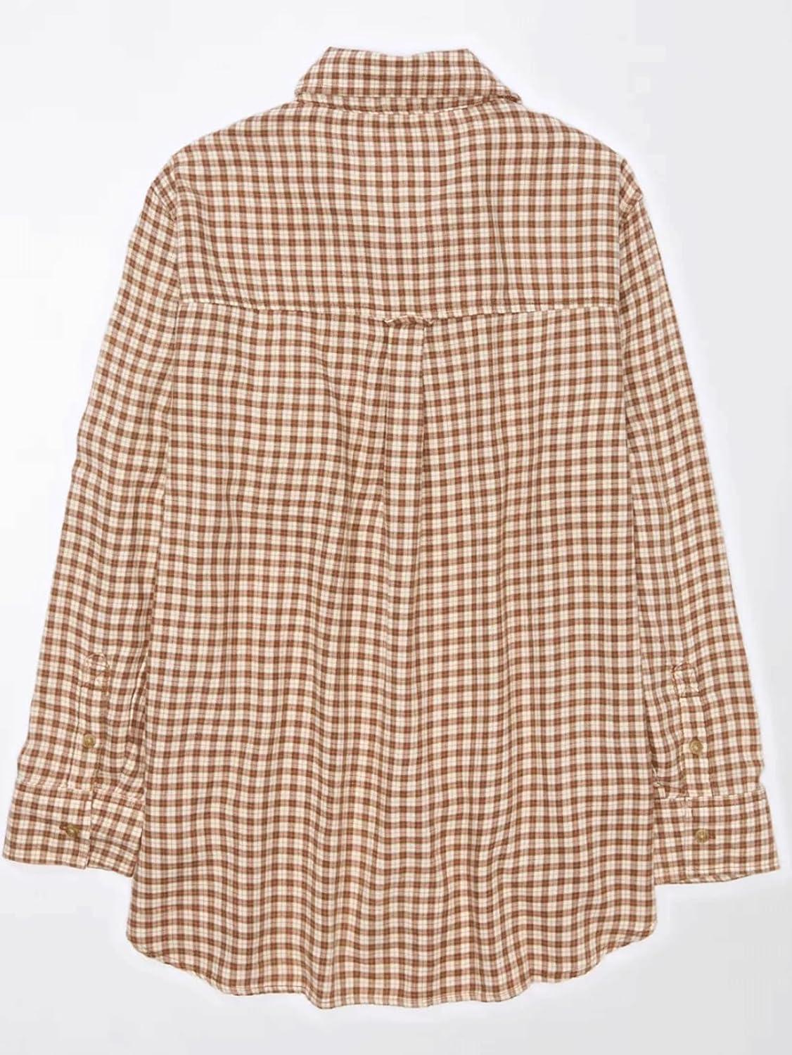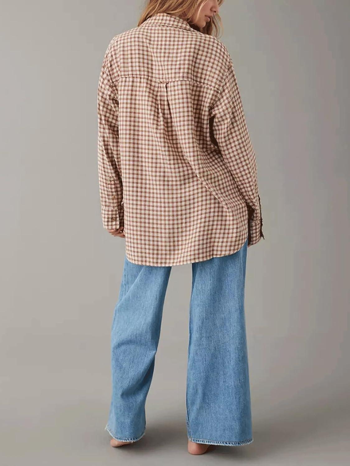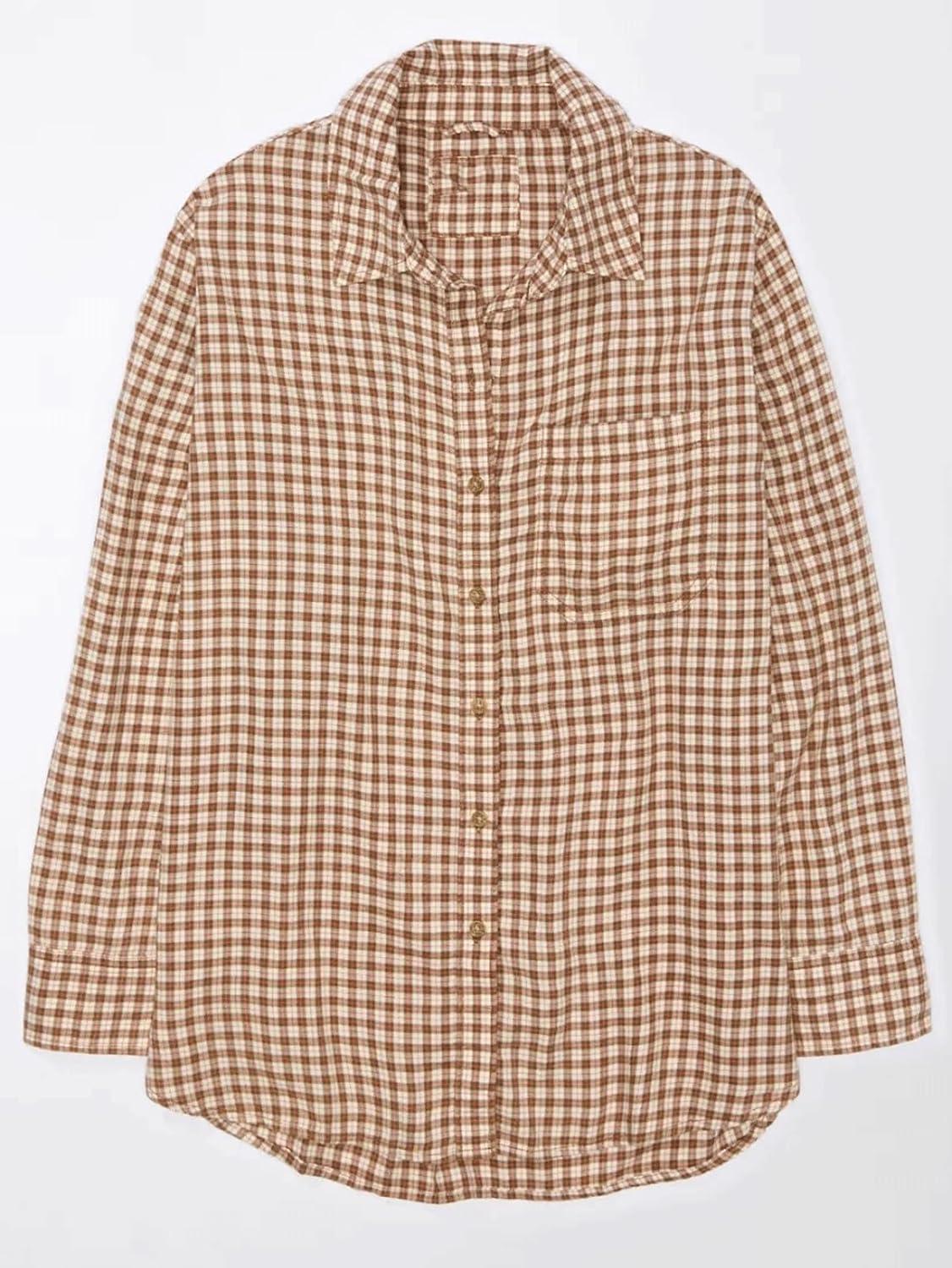 CHARTOU Women Baggy Plaid Blouses Button Down Long Sleeve Shirt Lightweight Cotton Collared Tops with Pocket(Brown)