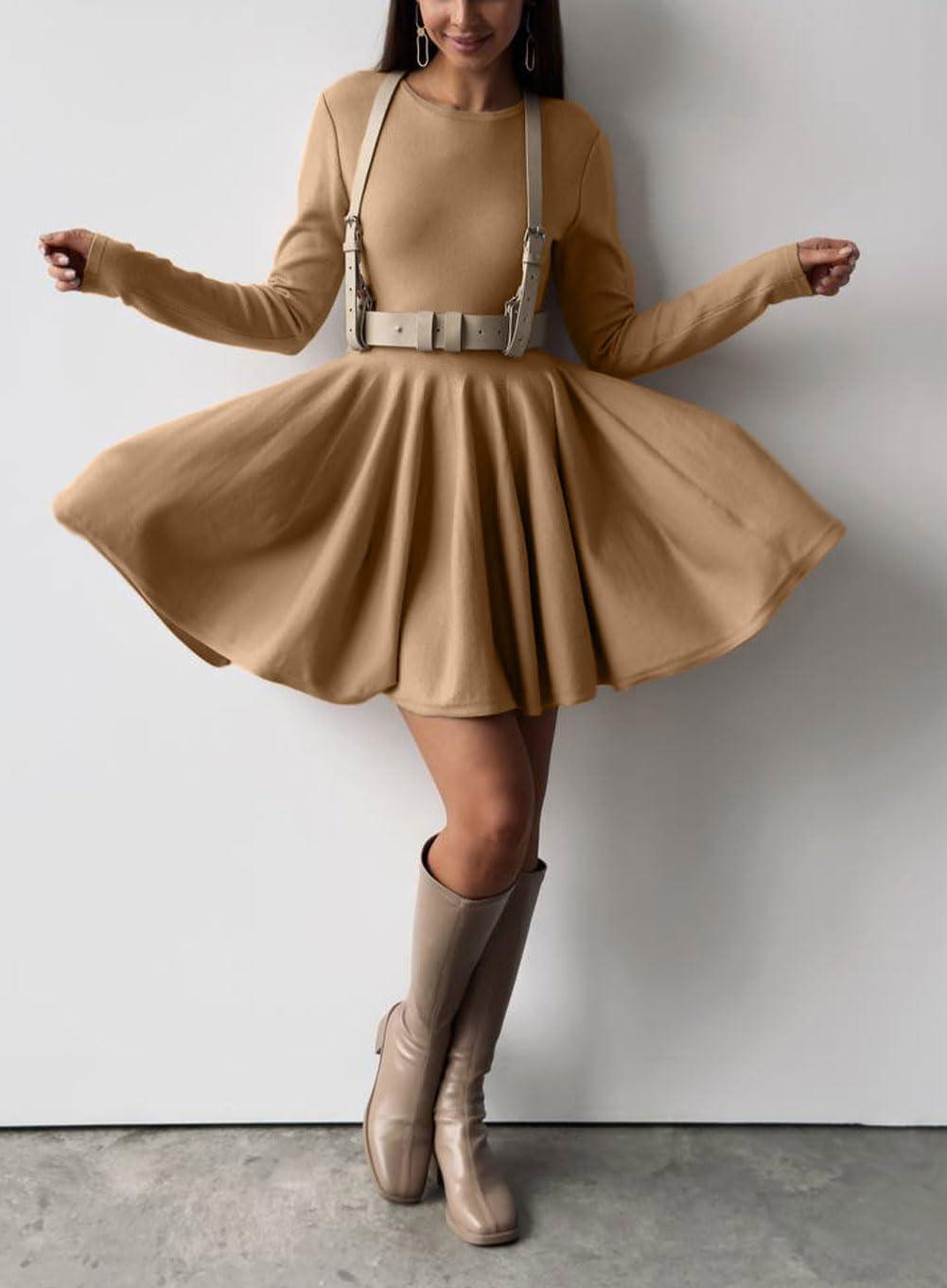 CHARTOU Women Basic Sweater Dress Long Sleeve Pleated Flared Knitted Short Dresses(Khaki)