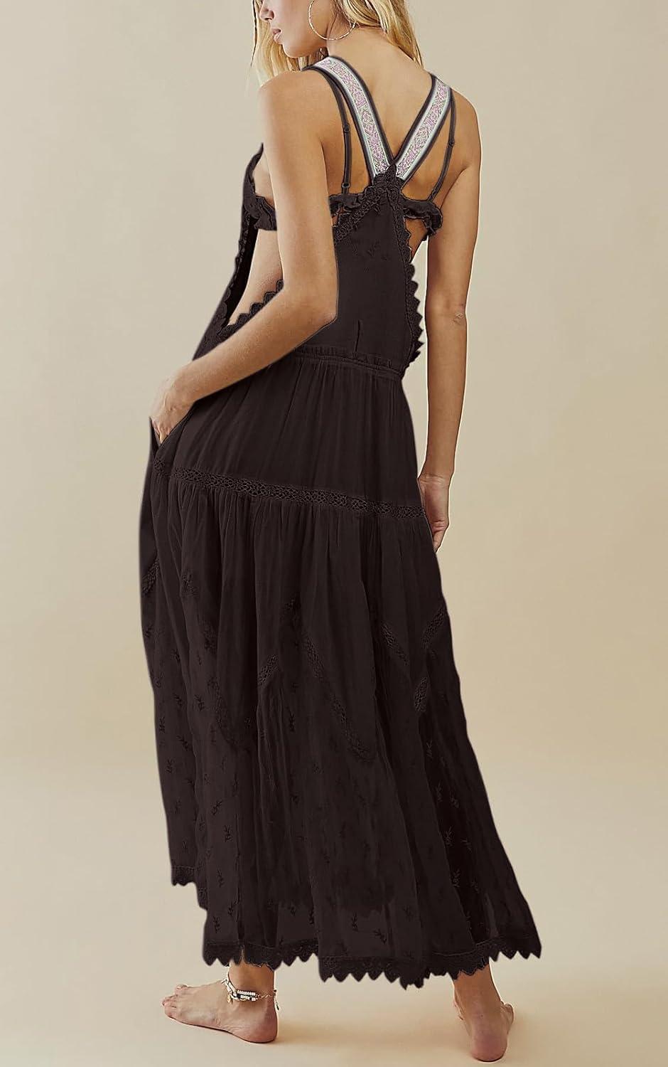 imageCHARTOU Women Bib Overall Dress Jumper Babydoll Pinafore Dress Embroidered Lace Maternity Straps Suspender DressBlack