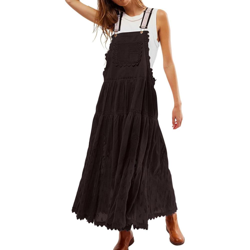 CHARTOU Women Bib Overall Dress Jumper Babydoll Pinafore Dress Embroidered Lace Maternity Straps Suspender Dress(Coffee)