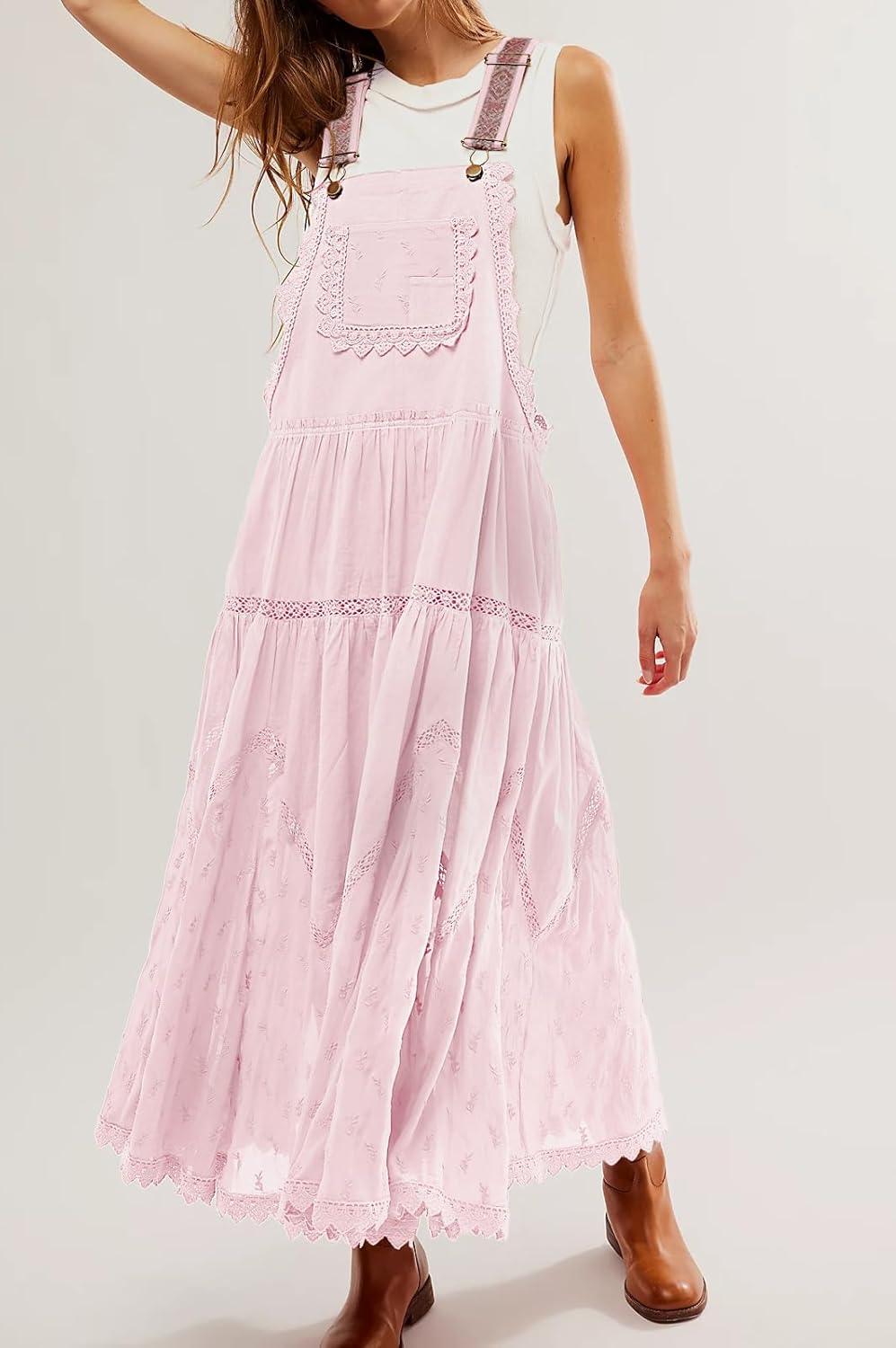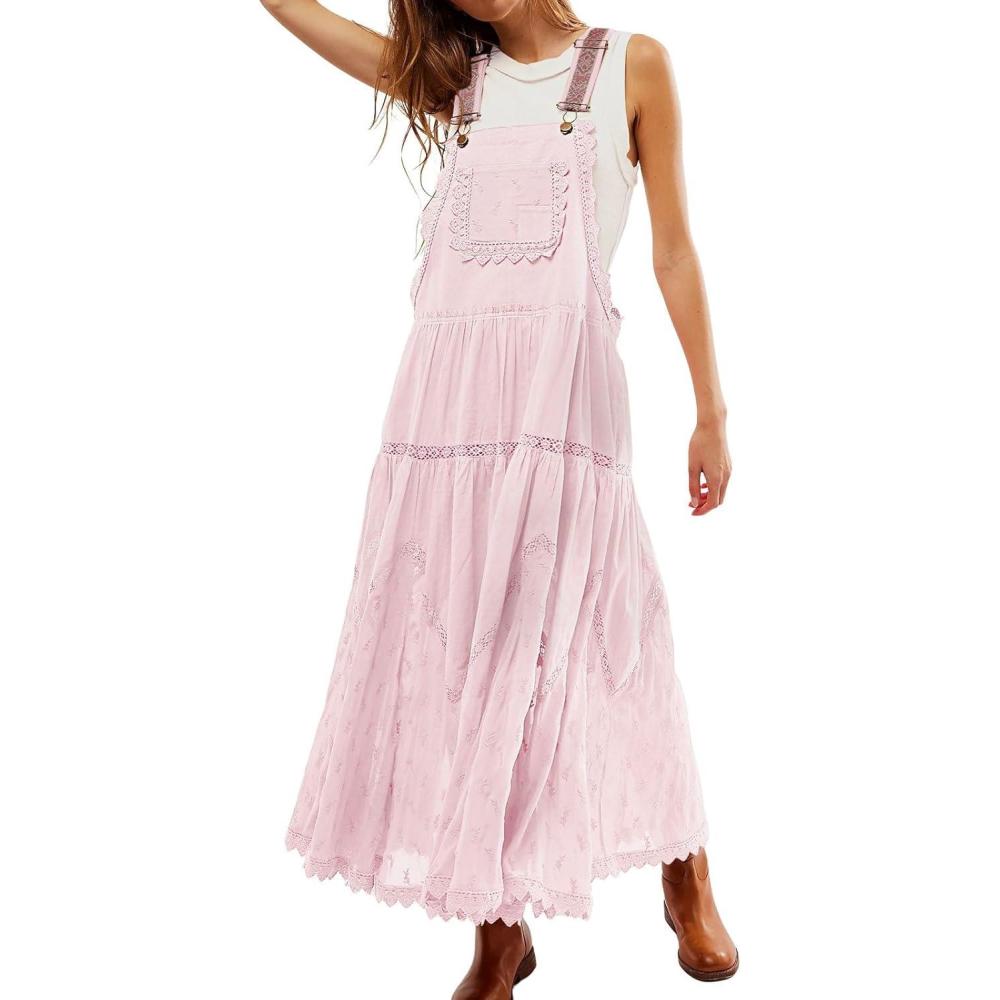 CHARTOU Women Bib Overall Dress Jumper Babydoll Pinafore Dress Embroidered Lace Maternity Straps Suspender Dress(Pink)