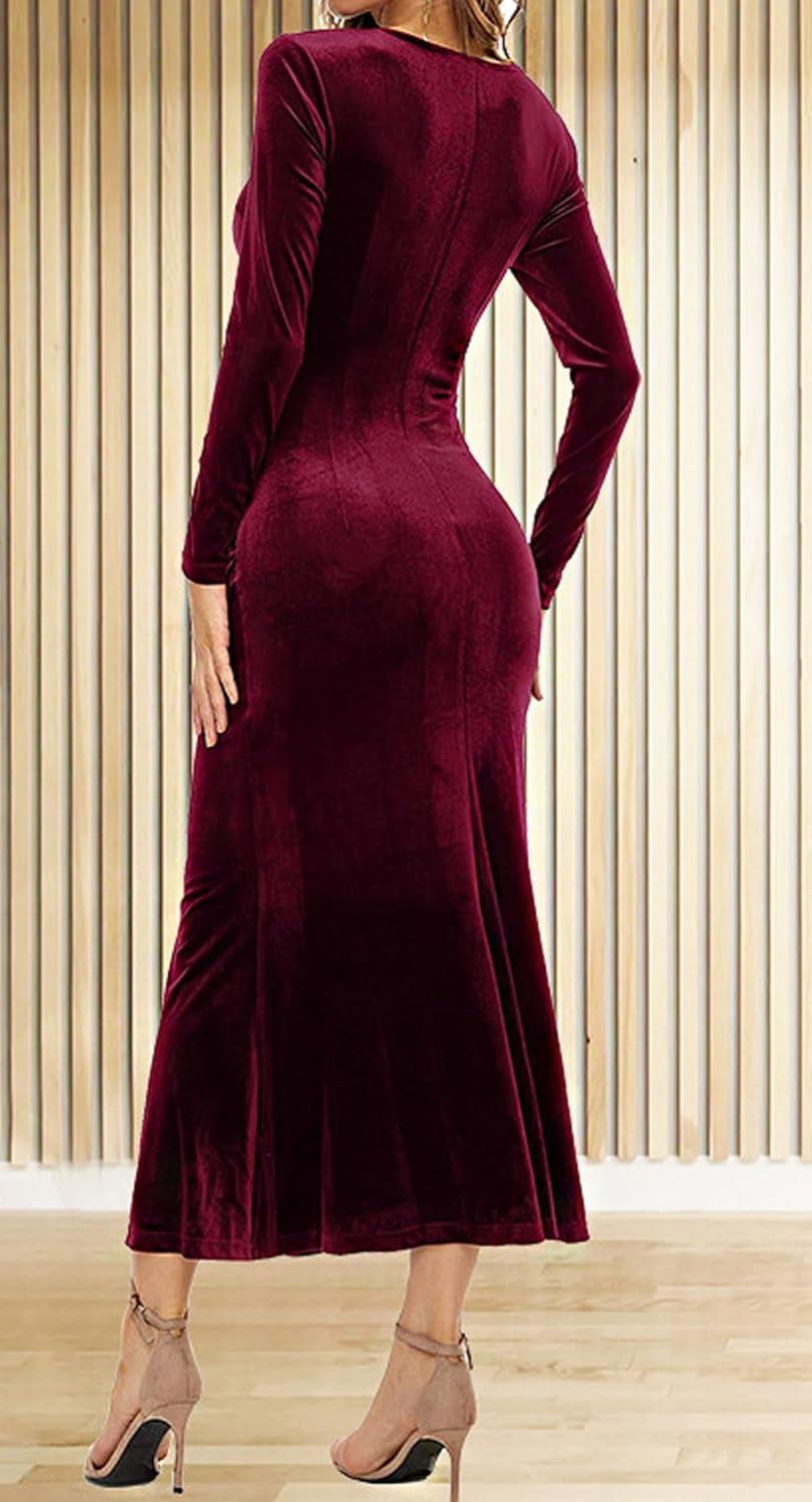 CHARTOU Women Bodycon Maxi Velvet Dress Long Sleeve Formal Dress Cocktail Wedding Quest Dress Wrap Evening Gown(Wine Red)