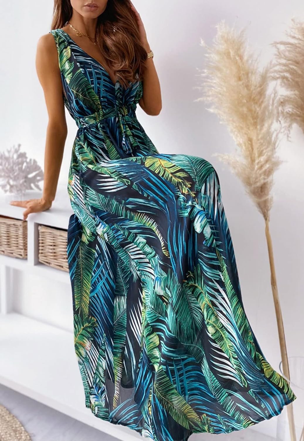 CHARTOU Women Boho Floral Maxi Dress Beach Long Flowy Dress Sleeveless Open Back Dress Hippie Sundress Summer(Green)