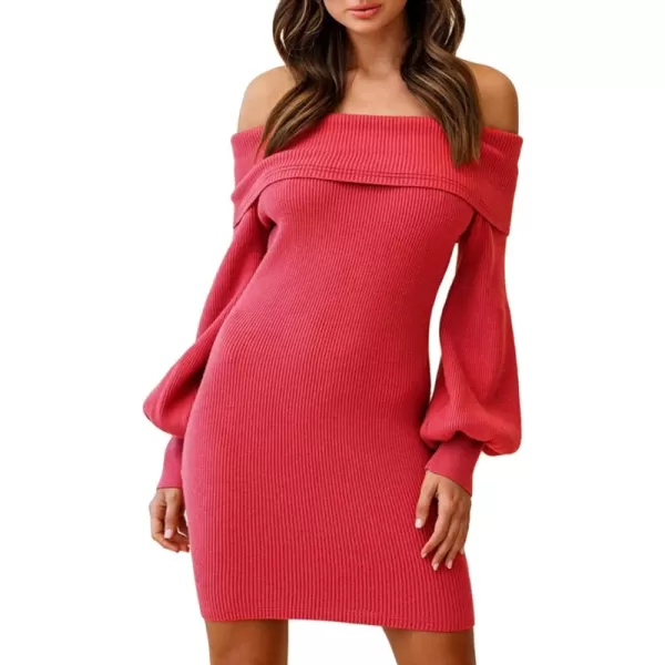 CHARTOU Women’s Elegant Off Shoulder Lantern Sleeve Knit Ribbed Bodycon Mini Tube Dress Sheath(Red)