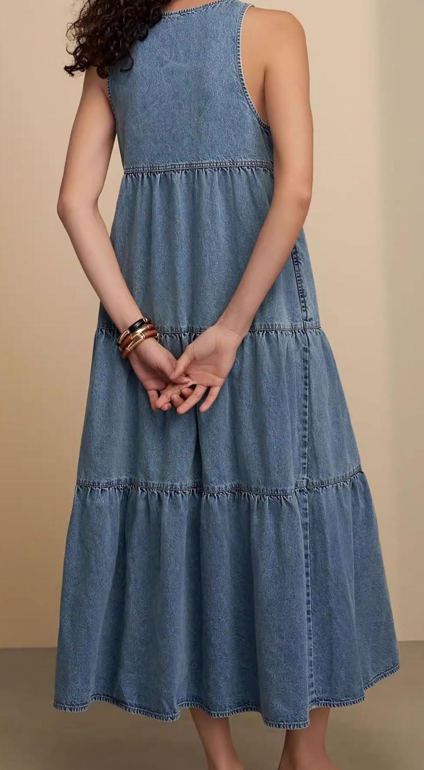 Bow Tie Front Denim Dress/ Sleeveless Tank Denim Dress/ Lightweight Denim Dress/ Flowy Beach Denim Dress