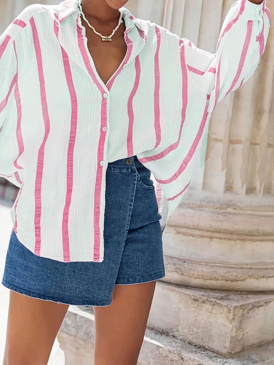 CHARTOU Women Button Down Shirt Stripe Oversized Lantern Long Sleeve Gauze Vacation Tops(Pink)