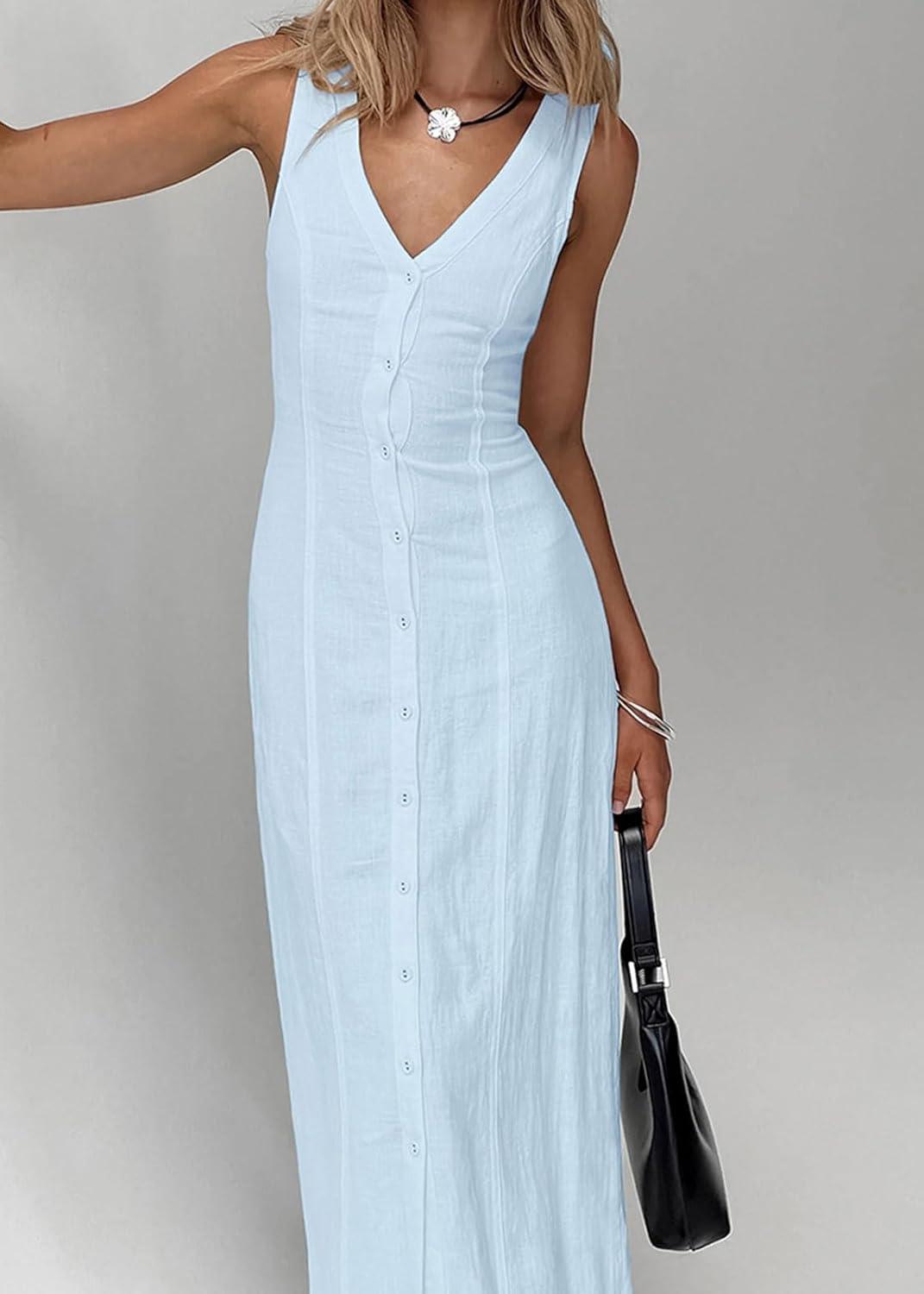 Women Button Down Sleeveless Cotton Maxi Dress Elegant V Neck Cinched High Waist Vest Dress Women temperament slim fit v-neck maxi dress/ Dressy button up sundress/ Chic body con long dress This casual summer dress is crafted from cotton fabric, combine lightweight and comfy spring outfits button down dress, skin-friendly, breathable and soft to wear in hot summer Single-breasted and button down closure, classic sleeveless, chic vest top silhouette, high waistband, slim fit, ankle-length, patchwork, elegant and stylish, solid color- light blue, pink summer dress for women, white Dressy sleeveless v neck long dress Button down cotton maxi dresses for women summer casual dress elegant sleeveless long dress high cinched waisted spring dress comfy slim fit white wedding guest dress lightweight pink patchwork dress v neck bodycon dress ankle length tank sundress