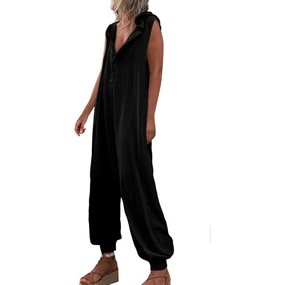 CHARTOU Women Button Sleeveless Jumpsuit Hooded Romper Lounge Romper Pants Harem Jumpsuit Cargo Pockets(Black)