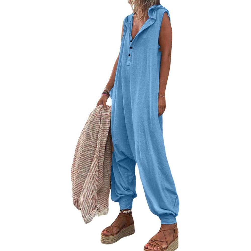 CHARTOU Women Button Sleeveless Jumpsuit Hooded Romper Lounge Romper Pants Harem Jumpsuit Cargo Pockets(Peacock Blue)