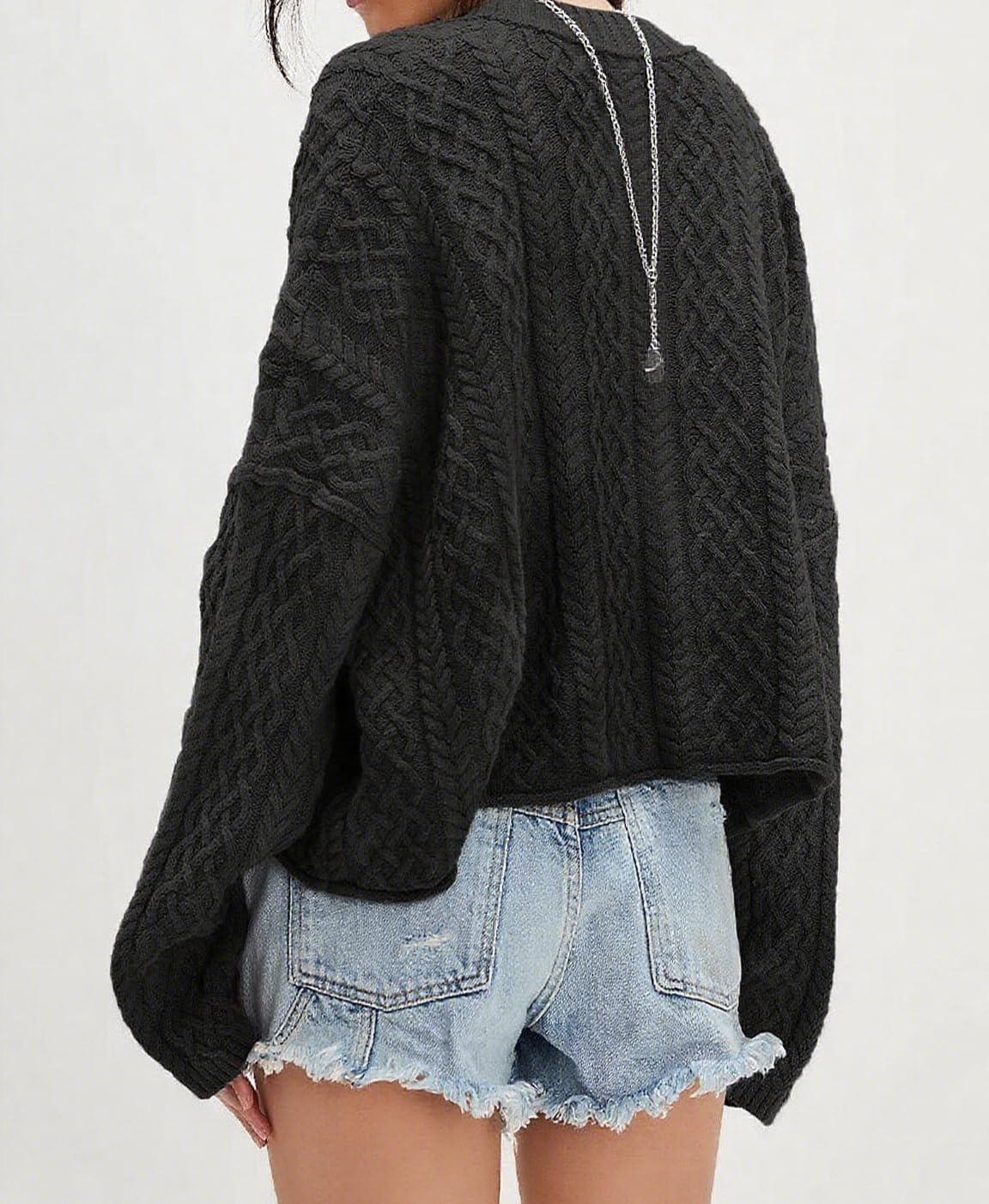 CHARTOU Women Cable Chunky Crop Cardigan Sweater V Neck Button Down Flared Sleeve Knit Sweater Coat(Black)