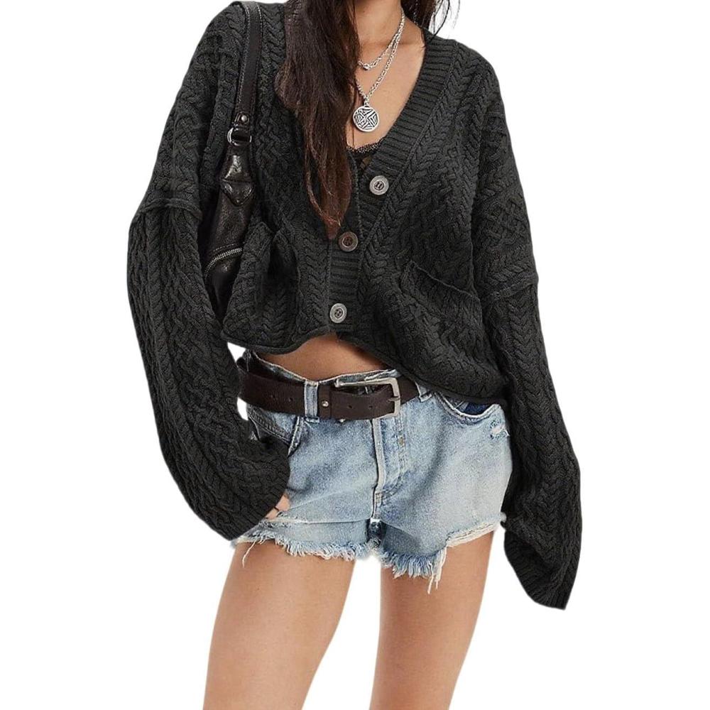 CHARTOU Women Cable Chunky Crop Cardigan Sweater/ Deep V Neck Button Down Sweater Coat/ Flared Long Sleeve Knit Jumper Tops/ Slouchy Off Shoulder Short Sweater/ Women Trendy 2025 Fall Spring Vacation Outfits