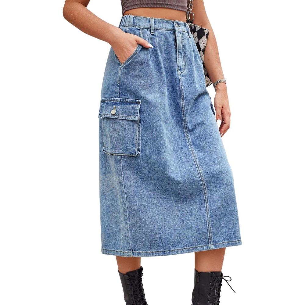 Women Casual High Waisted Denim Skirt Midi Jean Skirt Elastic Back A Line Skirt with Pockets Denim jean skirt, comfy and breathable to wear in spring, summer and fall Elastic back with zip front 【SELLING POINTS】—– Stretchy elastic high waist/ Multi pockets/ Solid color- blue jeans, light khaki, black, army green 【VERSATILE DENIM JEAN SKIRT】—- Weekend denim skirt midi jean skirt mid length, daily wear denim jeans cargo skirt y2k A line skirt, streetwear high waisted skirt zip up cargo denim skirt, going out patchwork skirt, holiday vacation denim jeans A line skirt, night club party blue jean skirts for women