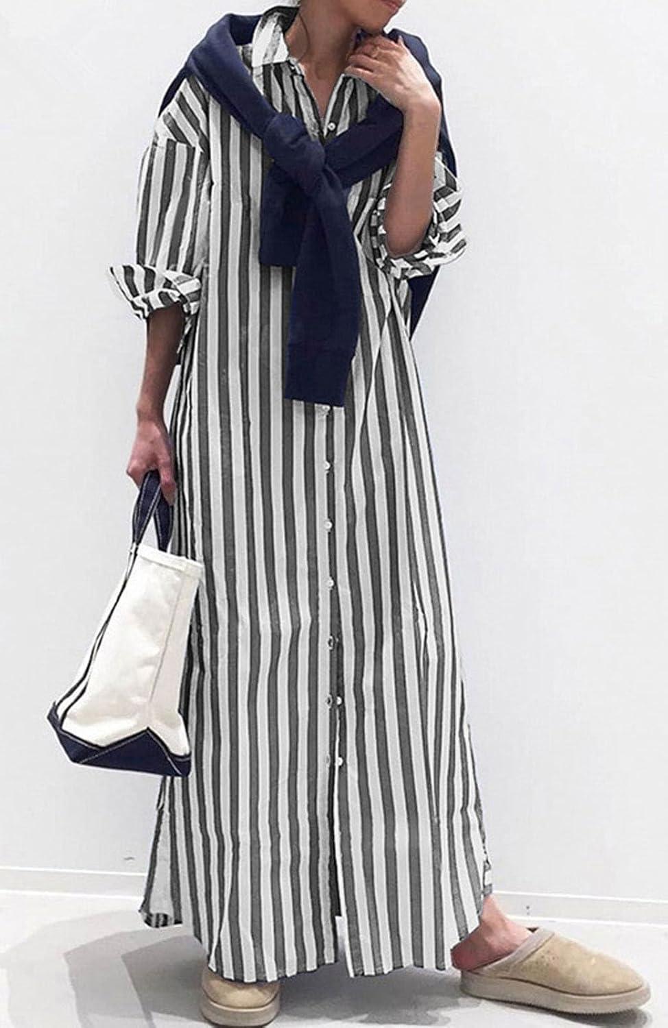 CHARTOU Women Casual Striped Shirt Dress Button Down Long Sleeve Kaftan Long Flowy Dress Cardigan Kimono Shift Dress(Blue)