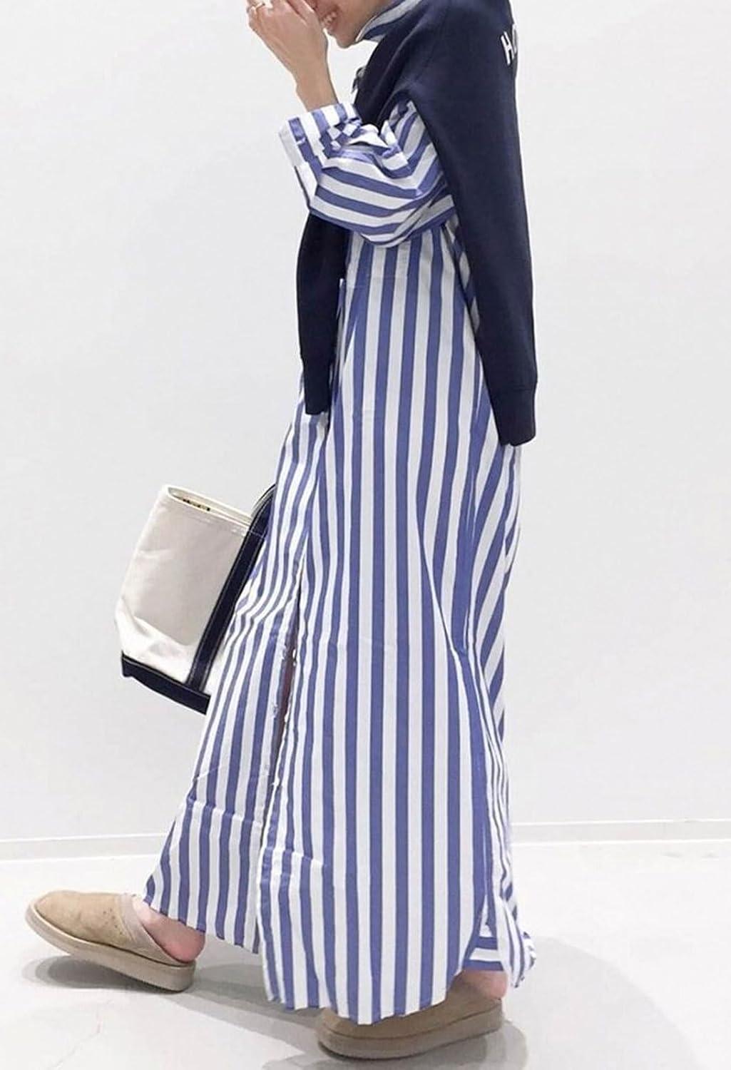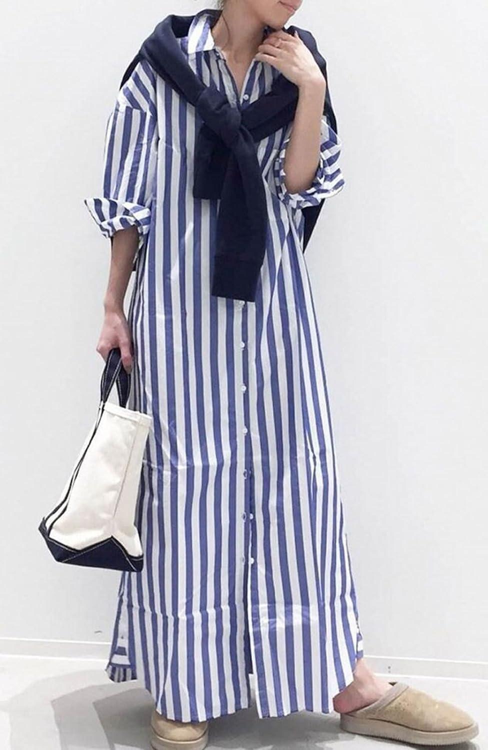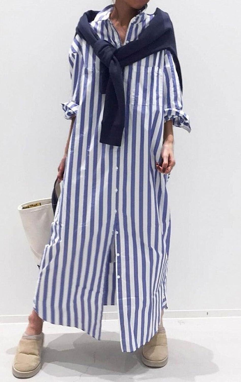 CHARTOU Women Casual Striped Shirt Dress Button Down Long Sleeve Kaftan Long Flowy Dress Cardigan Kimono Shift Dress(Blue)